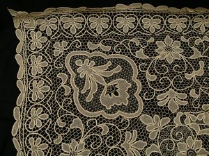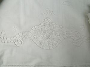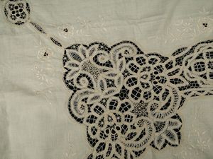 cm 270 cm x 160 (13) metà del XX secolo ricamata a motivi floreali, ad ago e intaglio, e con sfilature ed inserti [..]