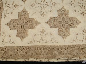 cm 270 cm x 160 (13) prima metà del XX secolo composto da parti in lino color crema ricamati ad intaglio con [..]
