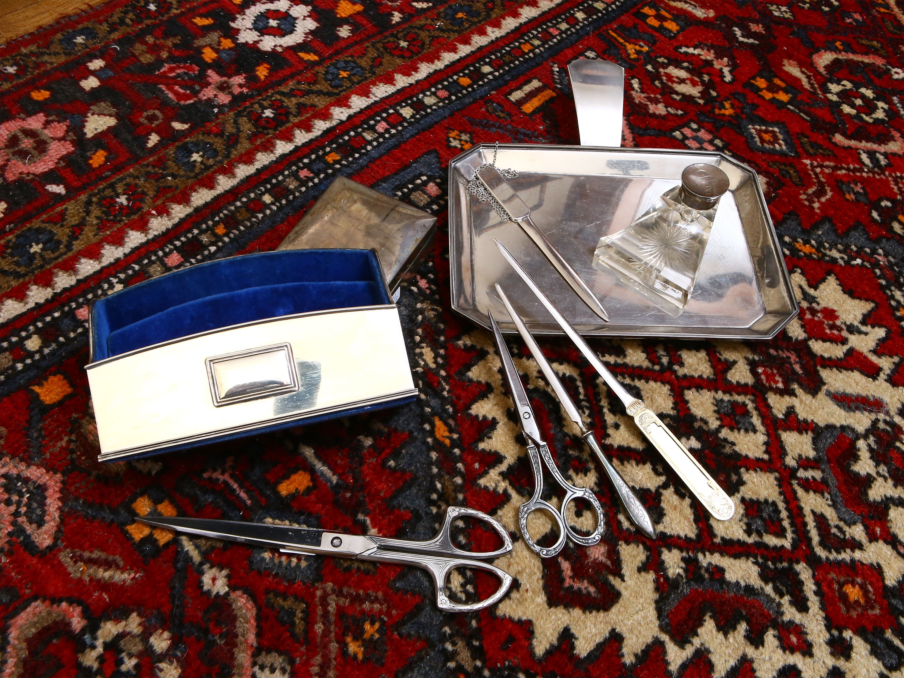 Lotto di curiosità da scrivania in metallo argentato e argento