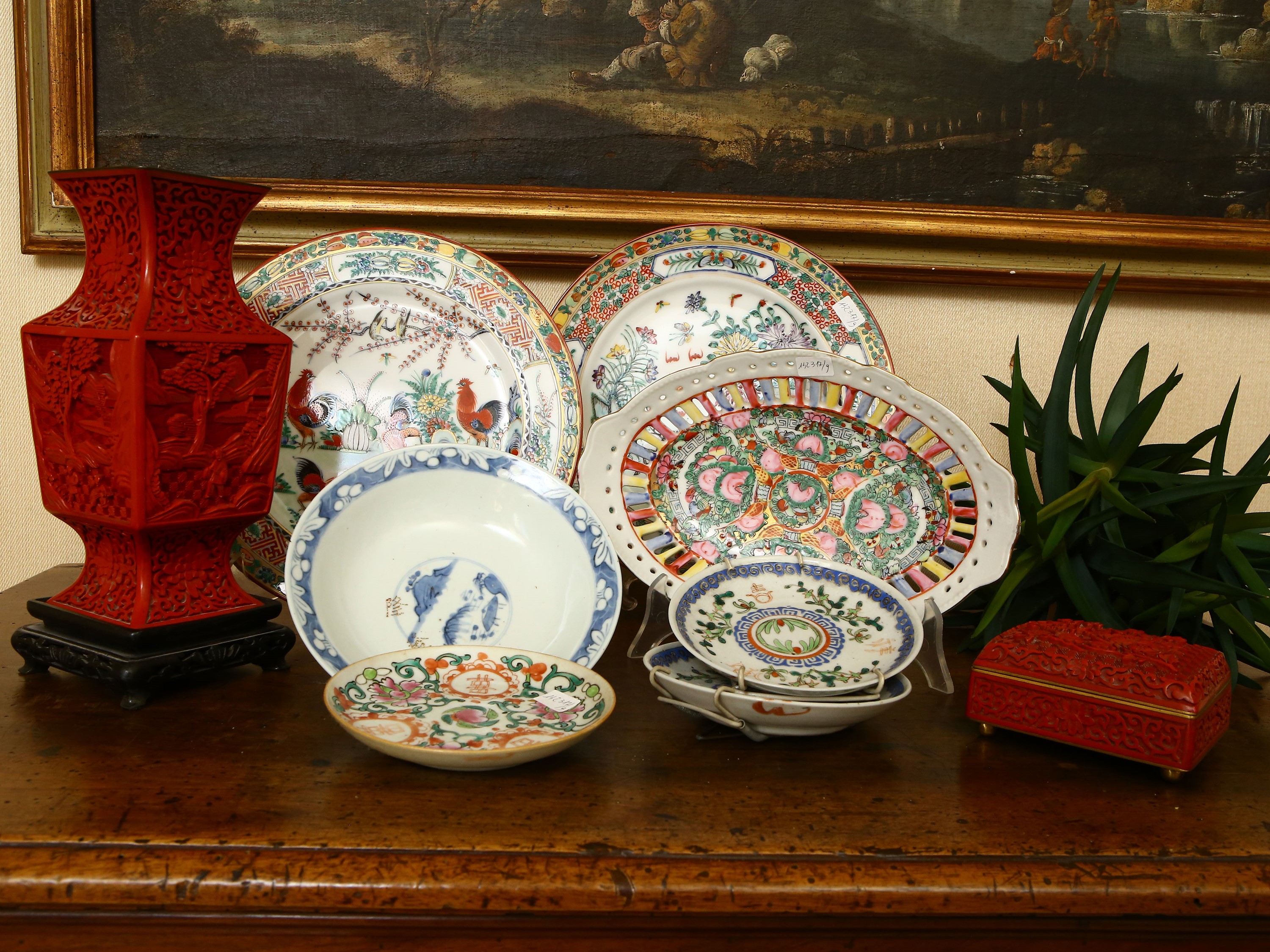 tra cui piatti di varie forme e tipologie ed un vaso e una scatola entrambi in lacca rossa