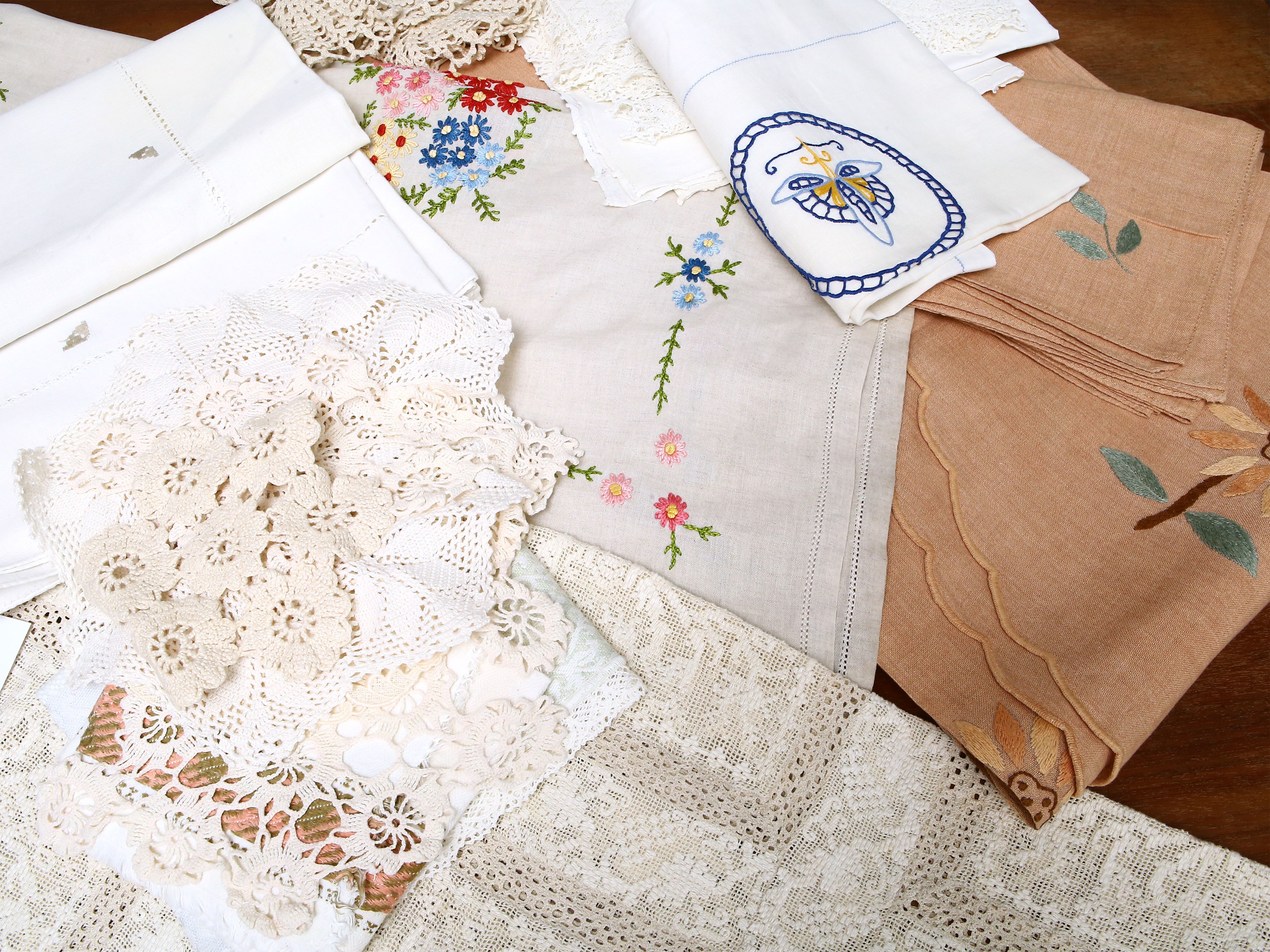 cm 160x140, cm 250x160 e cm 210x124 (23) seconda metà del XX secolo composto da una tovaglia in lino beige ricamata a motivi floreali multicolor, una ovale in lino marrone, corredata di 6 tovaglioli, ed un'altra in lino bianco, alcuni centrini a filet ed in lino, lievi difetti