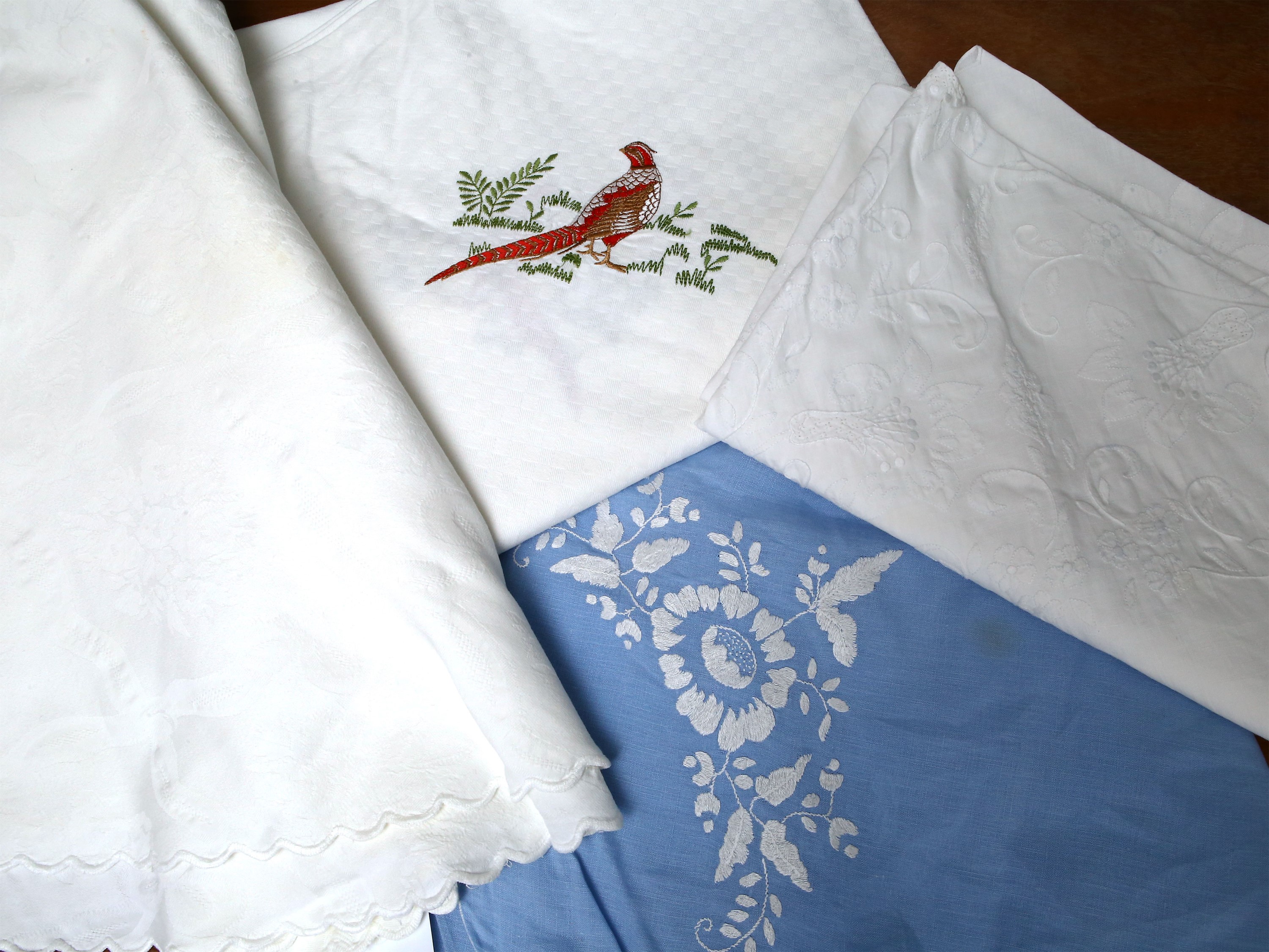 seconda metà del XX secolo tra cui una in lino azzurro con ricami floreali bianchi ed un altra in lino bianco, entrambe con bordi mossi, lievi macchie e segni d'uso