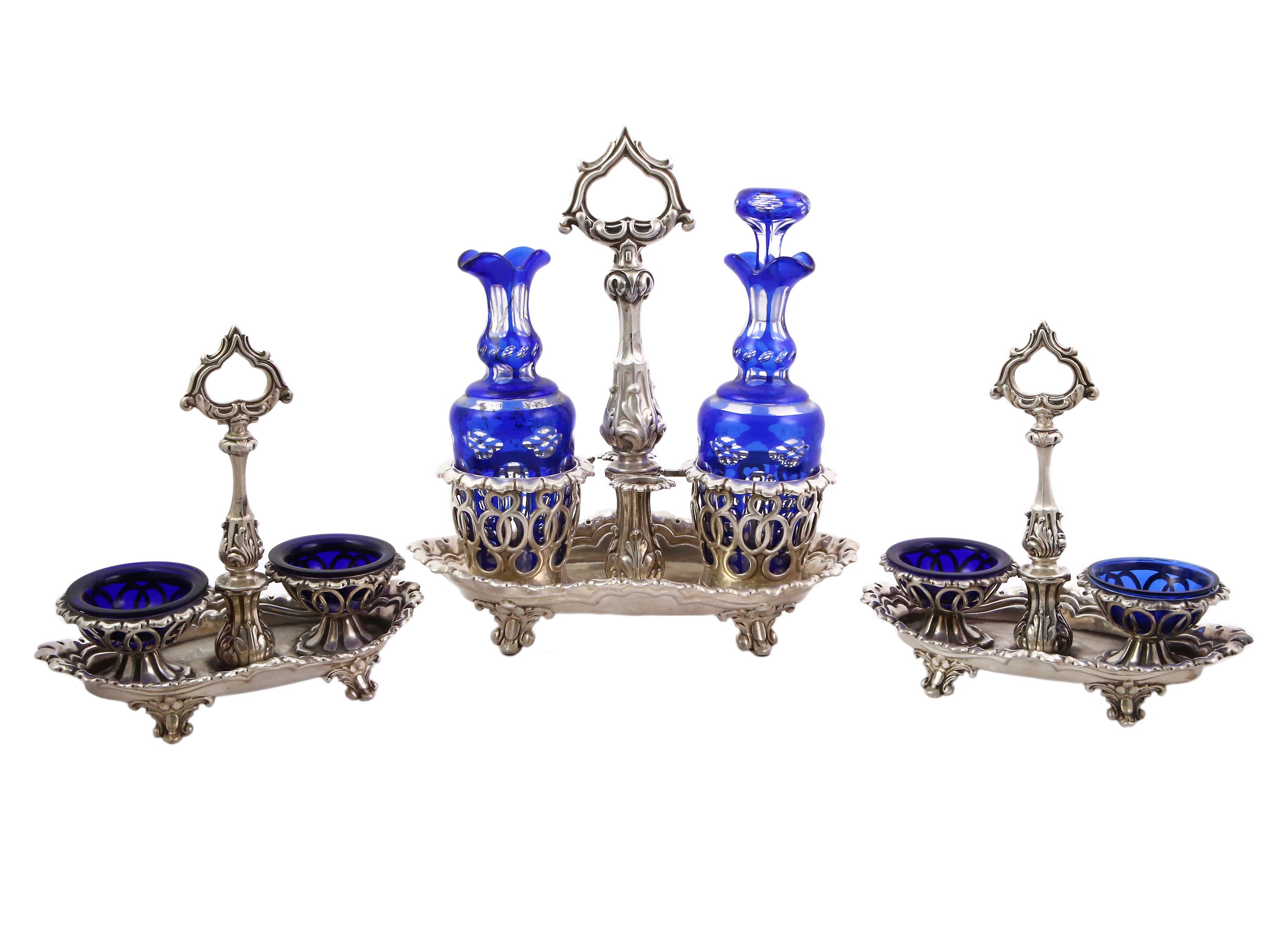 Francia, seconda metà del XIX secolo composto da oliera e coppia di doppie saliere, su basi ovali a cestino e presa centrale, sbalzate con volute e girali, flaconi in cristallo doppi blu di Boemia, un tappo mancante