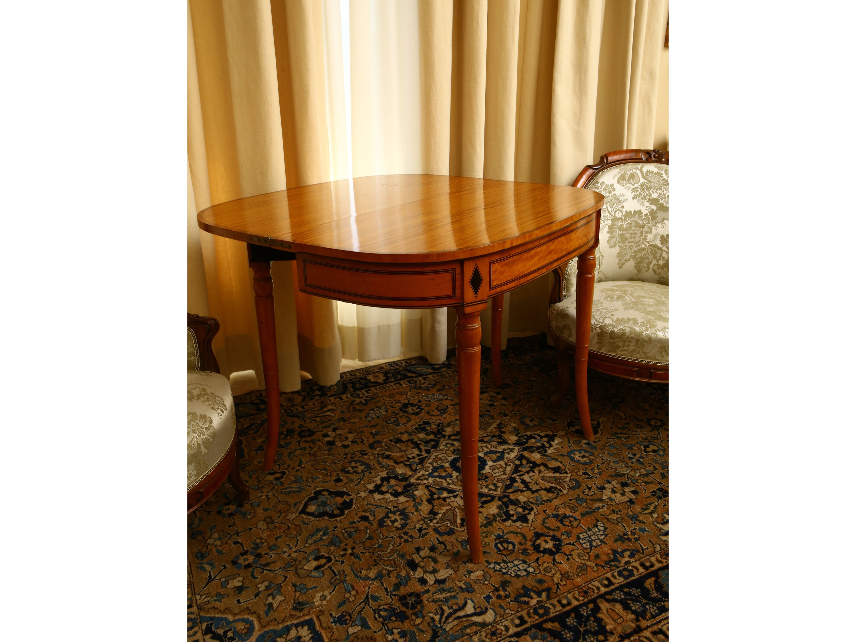 aperto h cm 75x90x88 seconda metà del XIX secolo impreziosito da filettature e motivi romboidali in legno ebanizzato, piano a mezzaluna apribile a libro, gambe a sciabola con attacco tornito