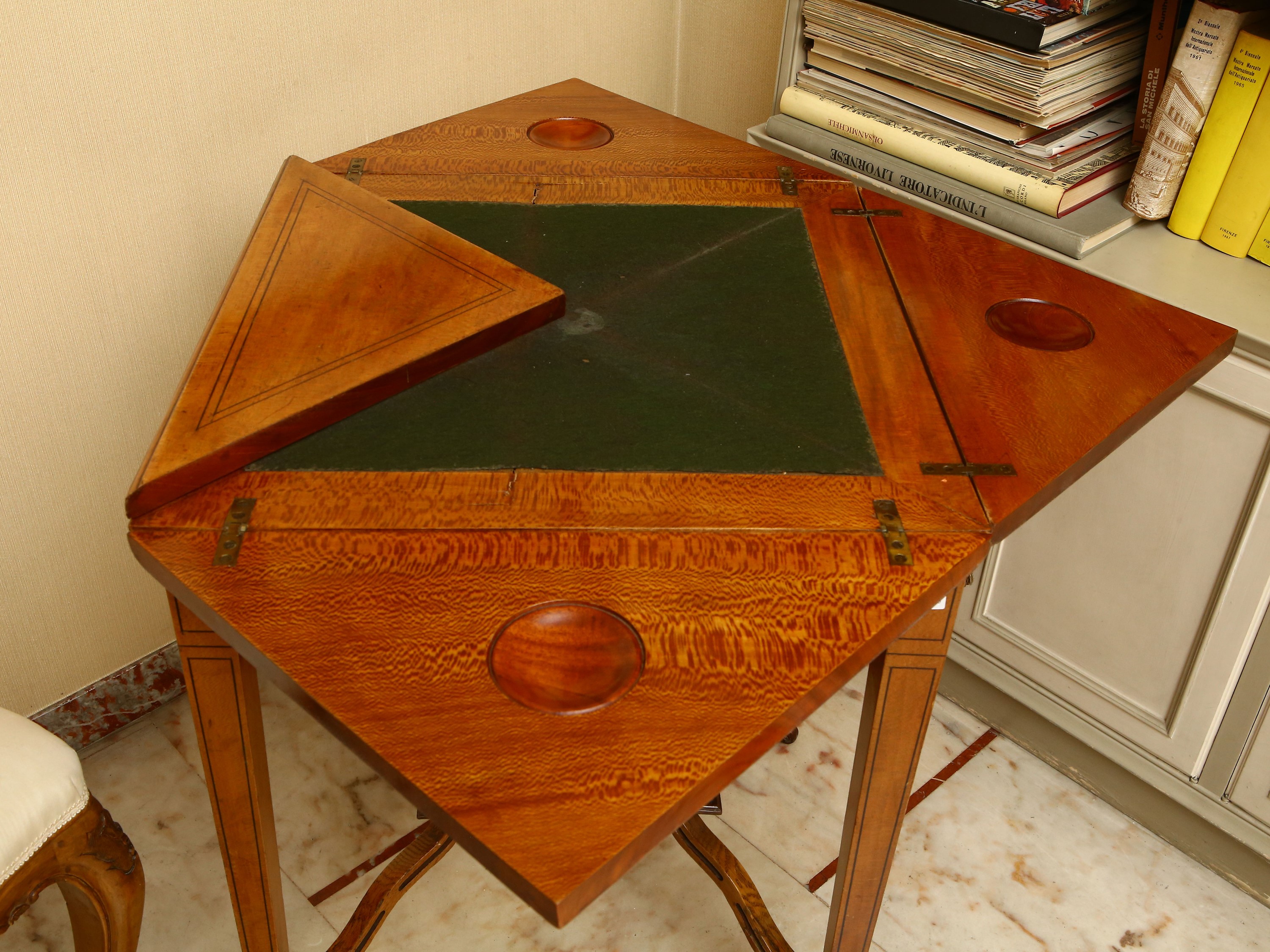 Tavolino da gioco a fazzoletto impialacciato in satinwood ed altre essenze