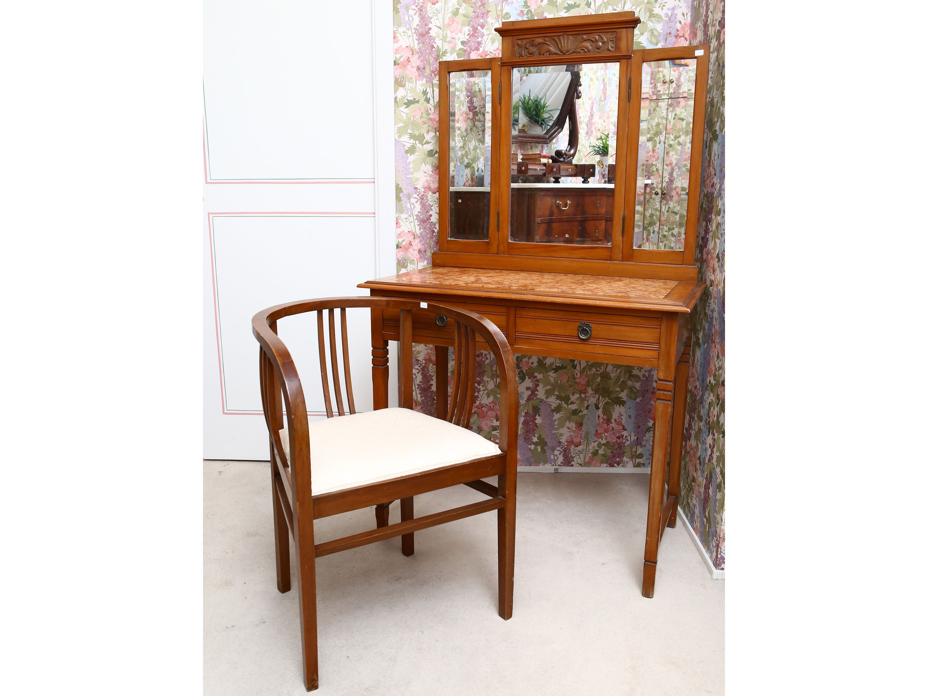 inizio del XX secolo con specchiera tripartita con ante pieghevoli, piano in marmo rosso di Verona, due cassetti nella fascia, corredata di poltroncina a pozzetto in noce, alcuni difetti