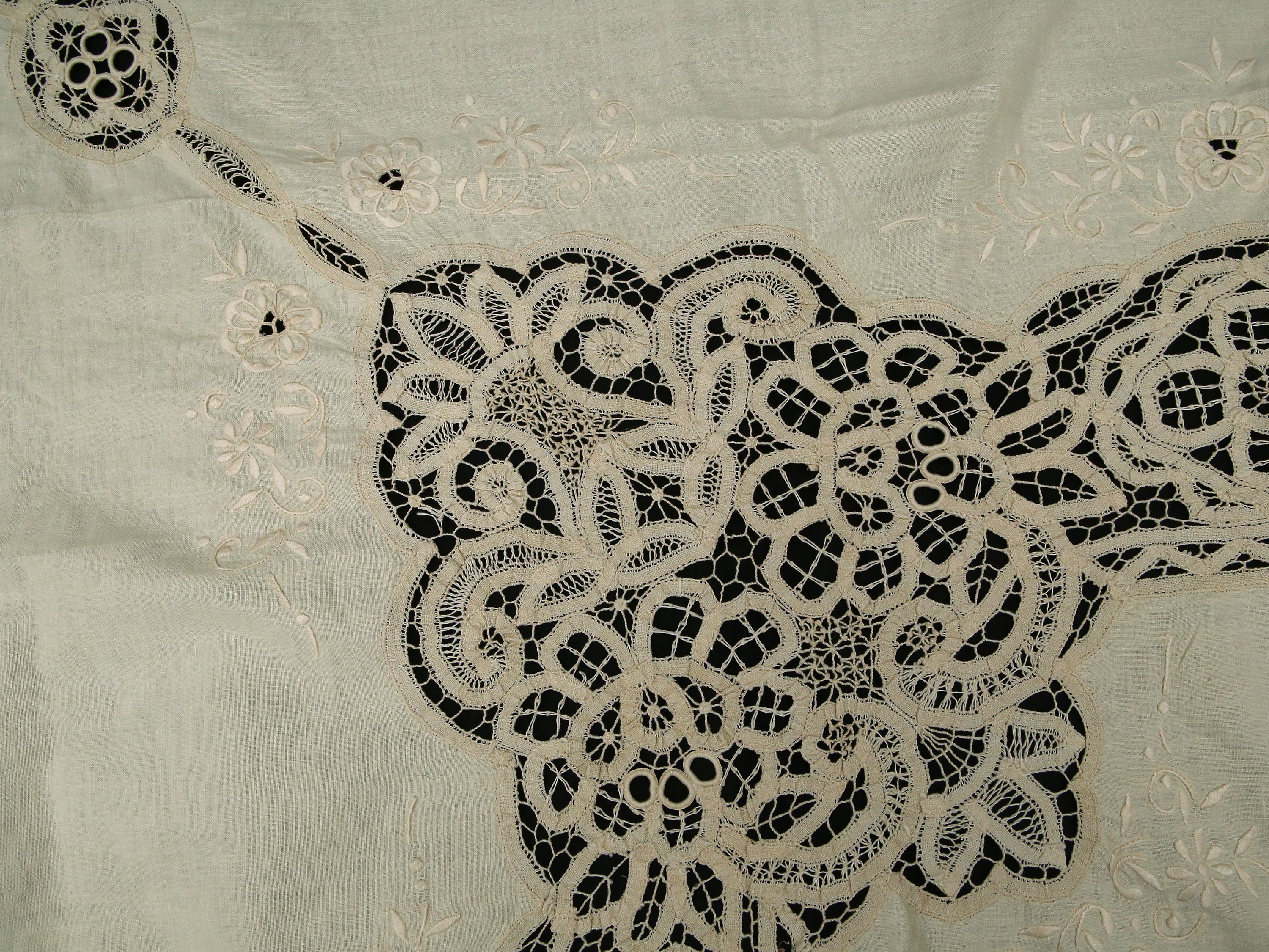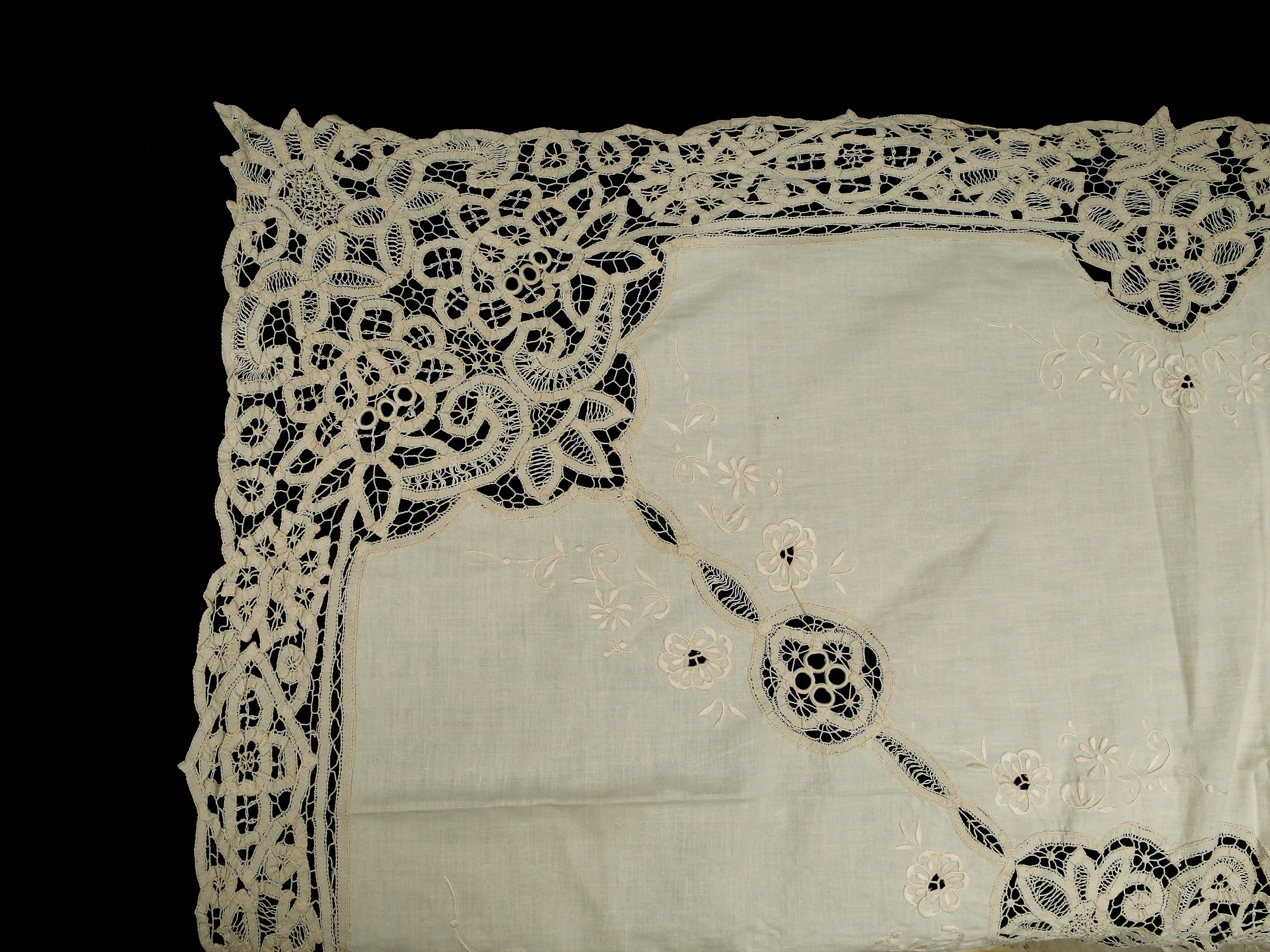 seconda metà del XX secolo ricami floreali ed inserti in pizzo a girali al centro e sui bordi, lievi difetti