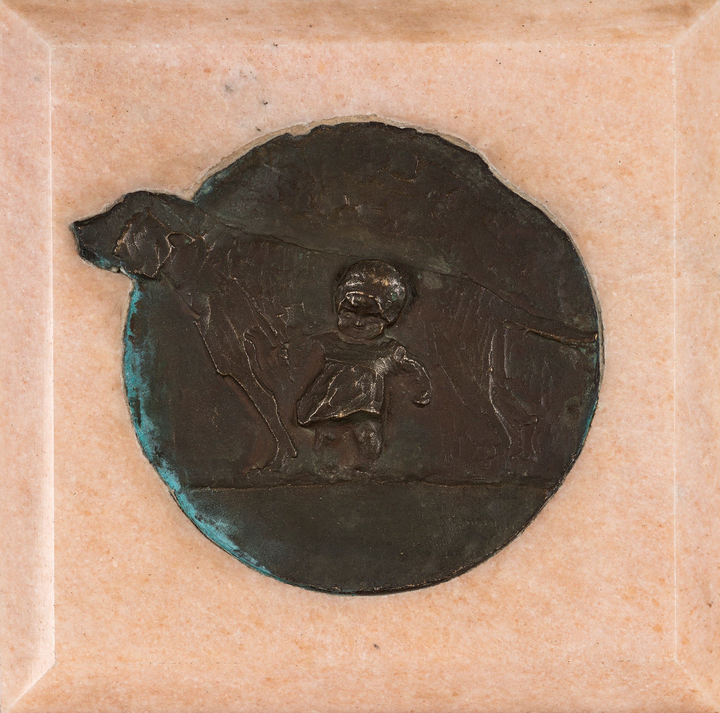 bassorilievo in bronzo applicato su marmo rosa di portogallo, cm 25 x 25 (inclusa la base)