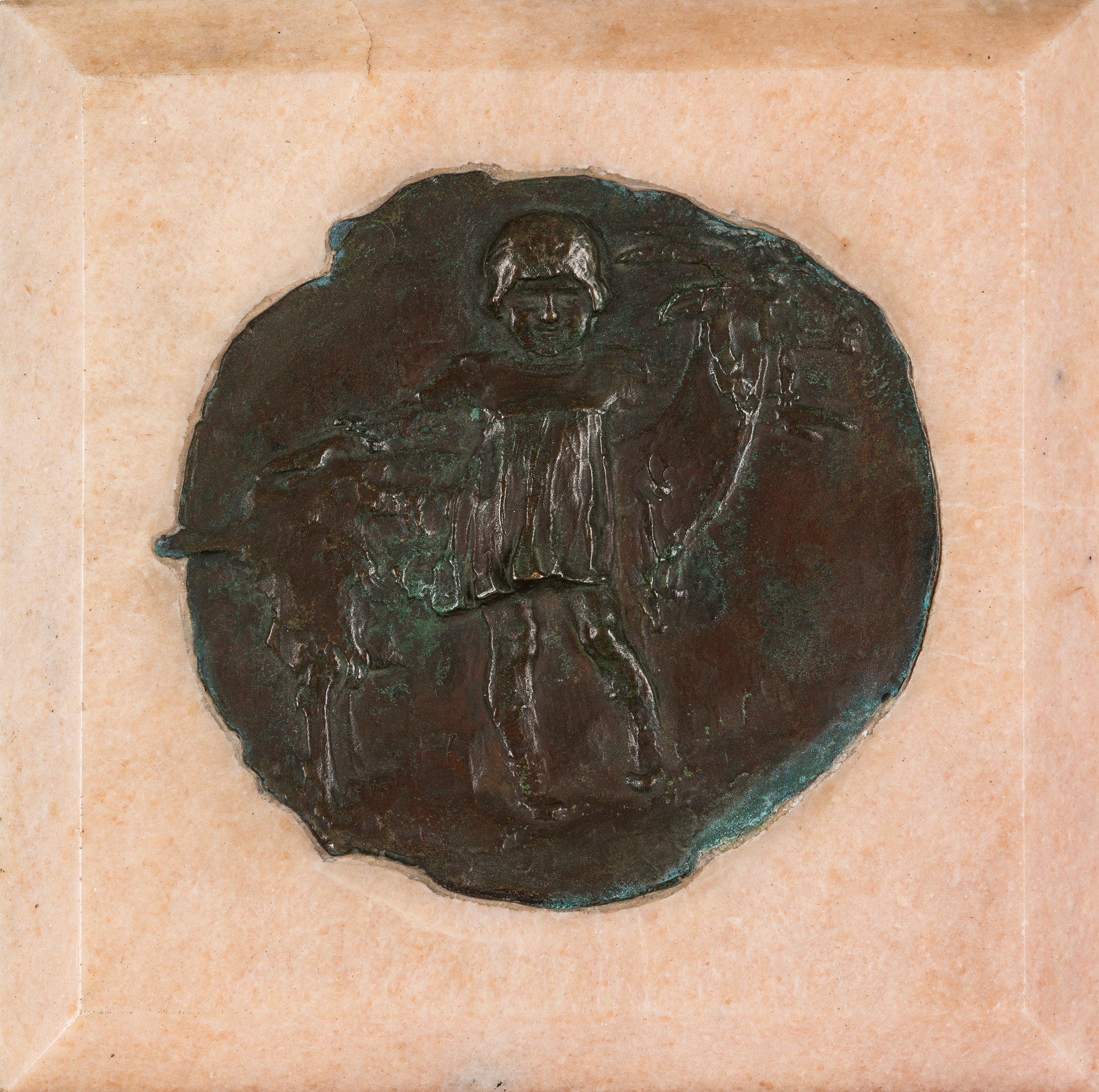 bassorilievo in bronzo applicato su marmo rosa di portogallo, cm 25 x 25 (inclusa la base)