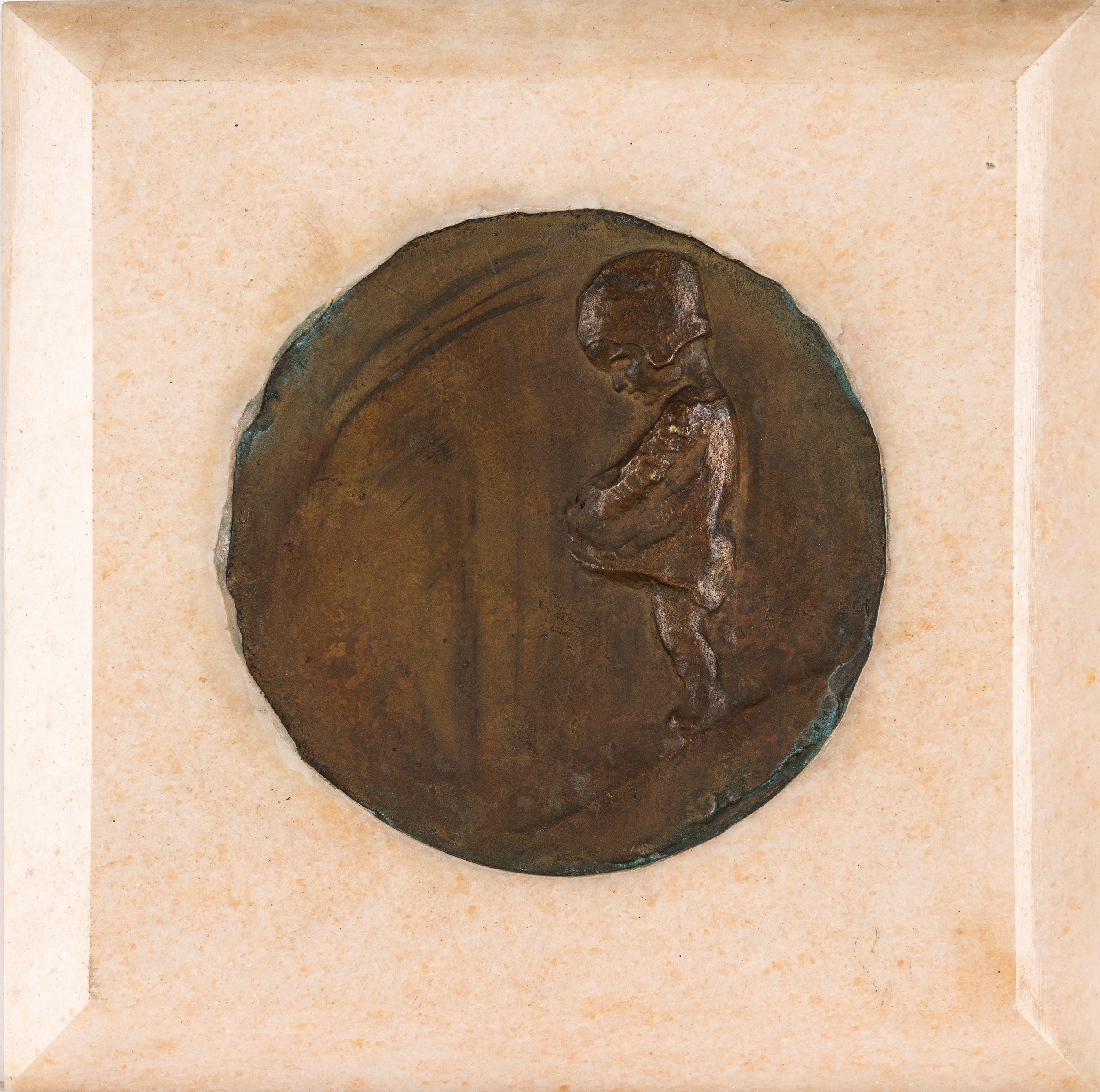 bassorilievo in bronzo applicato su marmo rosa di portogallo, cm 25 x 25 (inclusa la base)