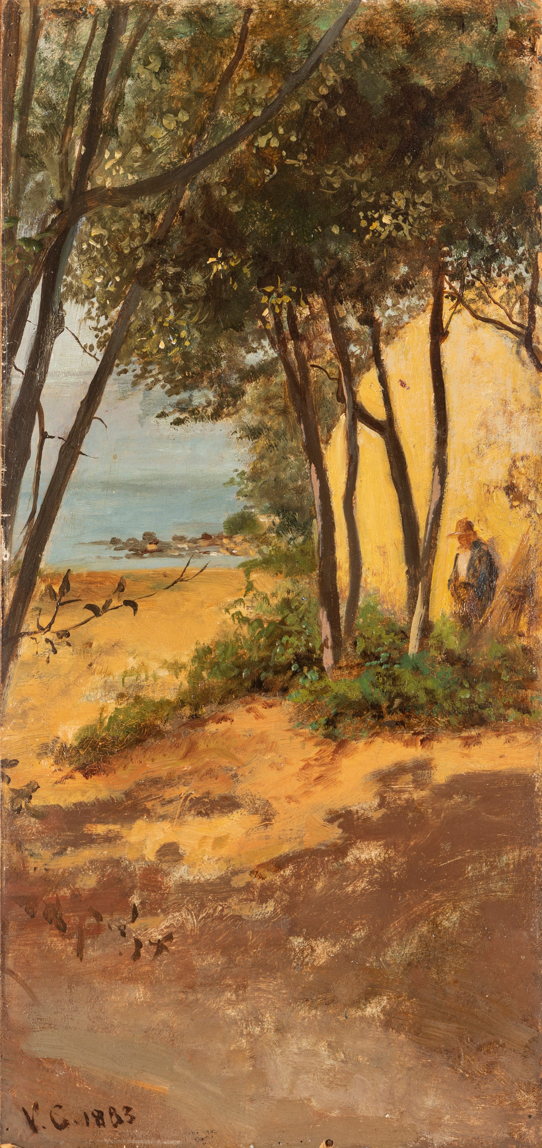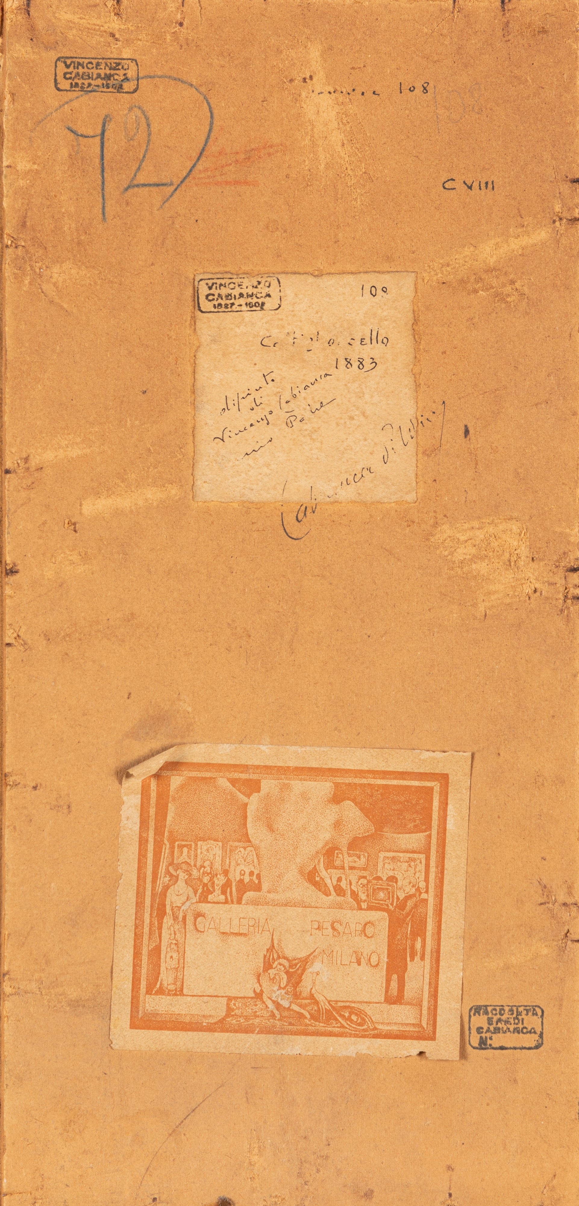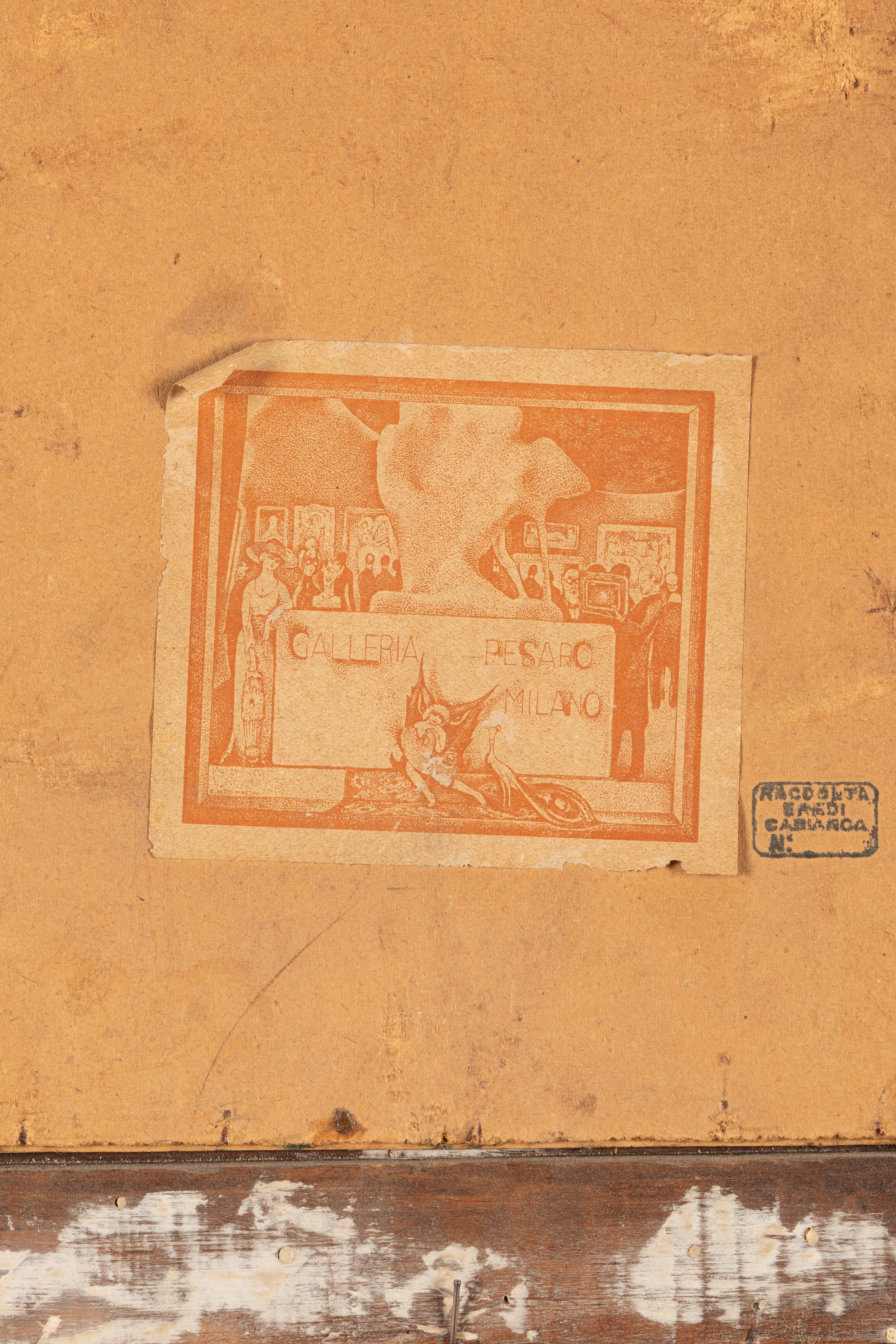 Sul retro: cartellino della Galleria Pesaro; cartellino con dichiarazione di autenticità a penna del figlio Silvio con titolo e data dell'opera; timbri del pittore e della Raccolta Eredi Cabianca.