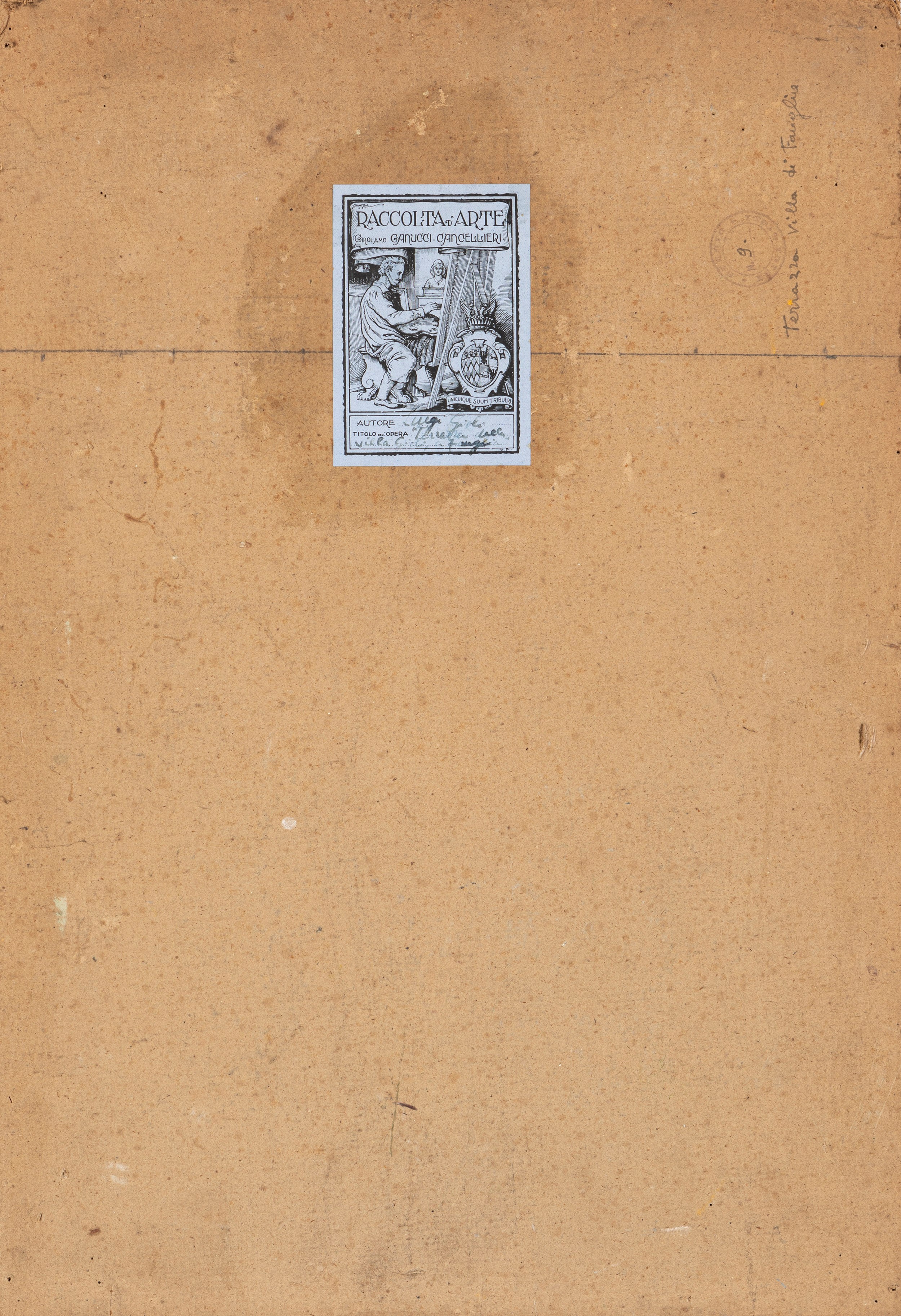 Sul retro, etichetta della Raccolta d'Arte Girolamo Ganucci Cancellieri con riferimenti all'artista e all'opera; timbro con numero di riferimento scritto a penna (9).
