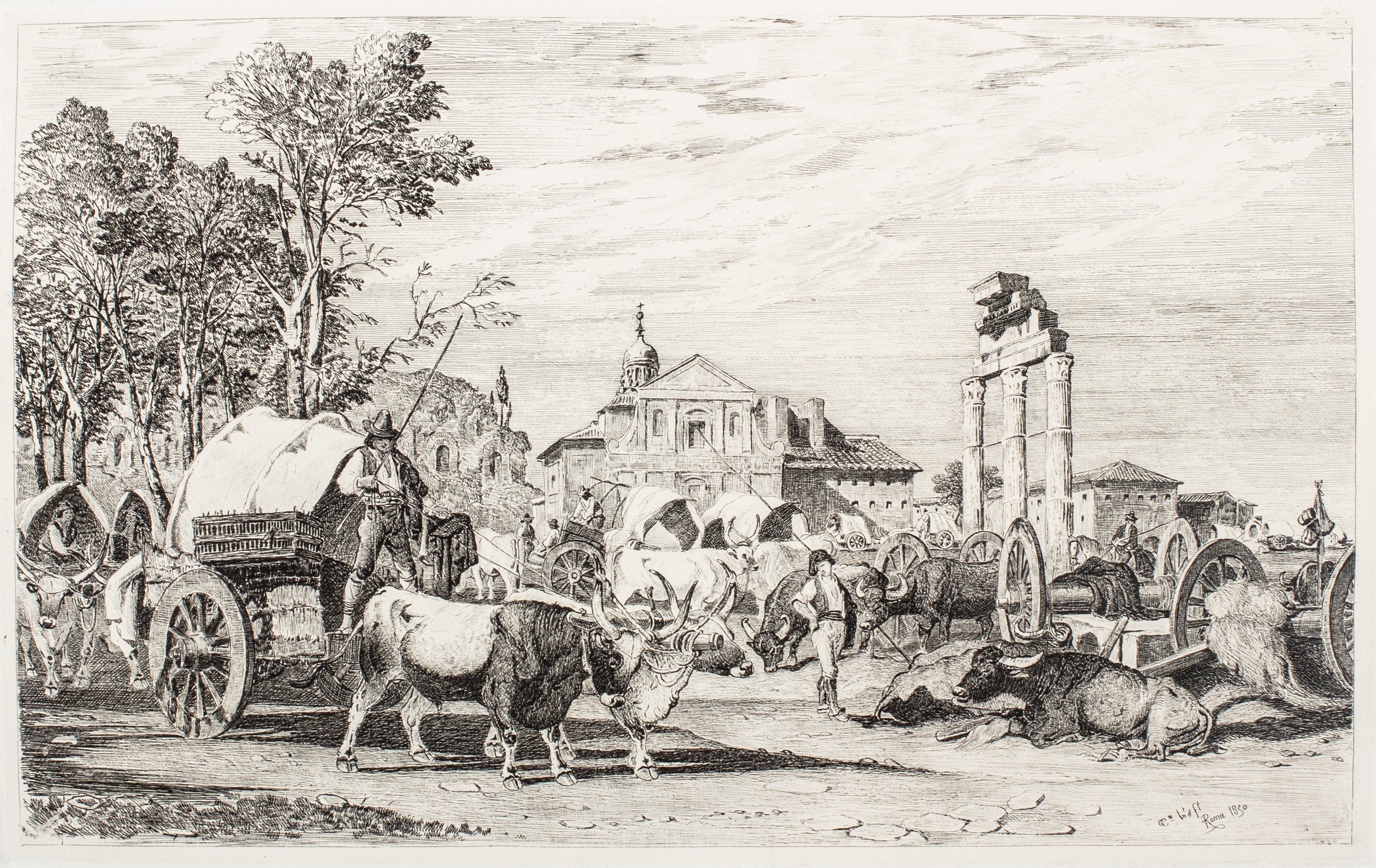 1850 Roma, 1850. In 2°. Con 35 tavole fuori testo contenenti 53 incisioni all'acquaforte, complessivamente, legatura dell'epoca § Insieme nel lotto Etudes progressives de Paysages par Perret, Lione, Pintard, s.d. 3 parti in 1 vol ognuna con proprio frontespizio. Album oblungo, vignetta al frontespizio, con 48 tavole con didascalia, lievi fioriture, alcune carte con i margini rifilati, legatura coeva in mezza pergamena, titolo in italiano impresso in oro al dorso liscio. Ex libris al contropiatto, sigla di appartenenza ai frontespizi.