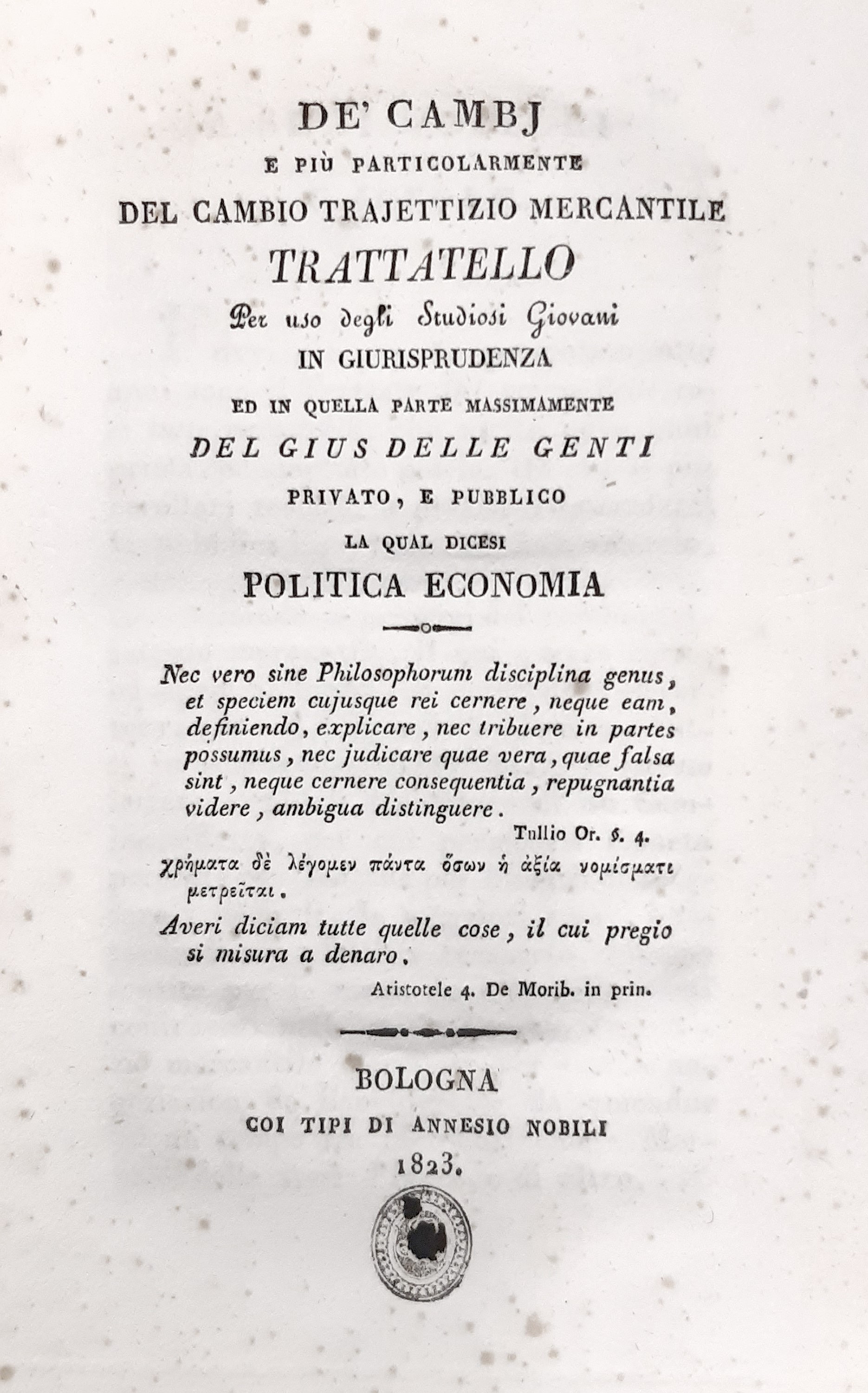 1823 Bologna, Annesio Nobili, 1823. Esemplare in barbe, con 1 tavola ripiegata, lievi fioriture, brossura editoriale con autore e titolo in nero al piatto anteriore entro cornice, mancanze al dorso, difetti. Timbro di appartenenza al frontespizio.