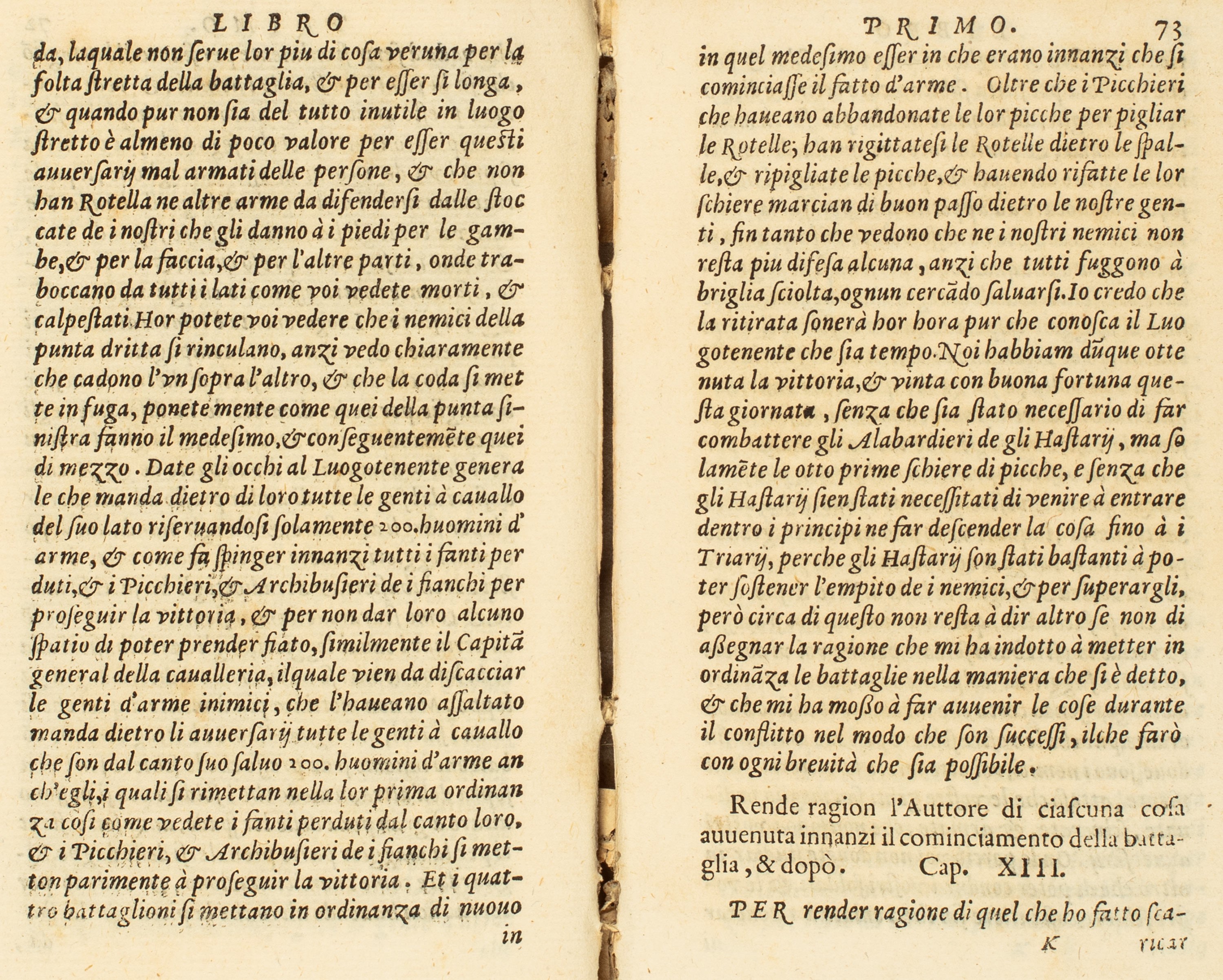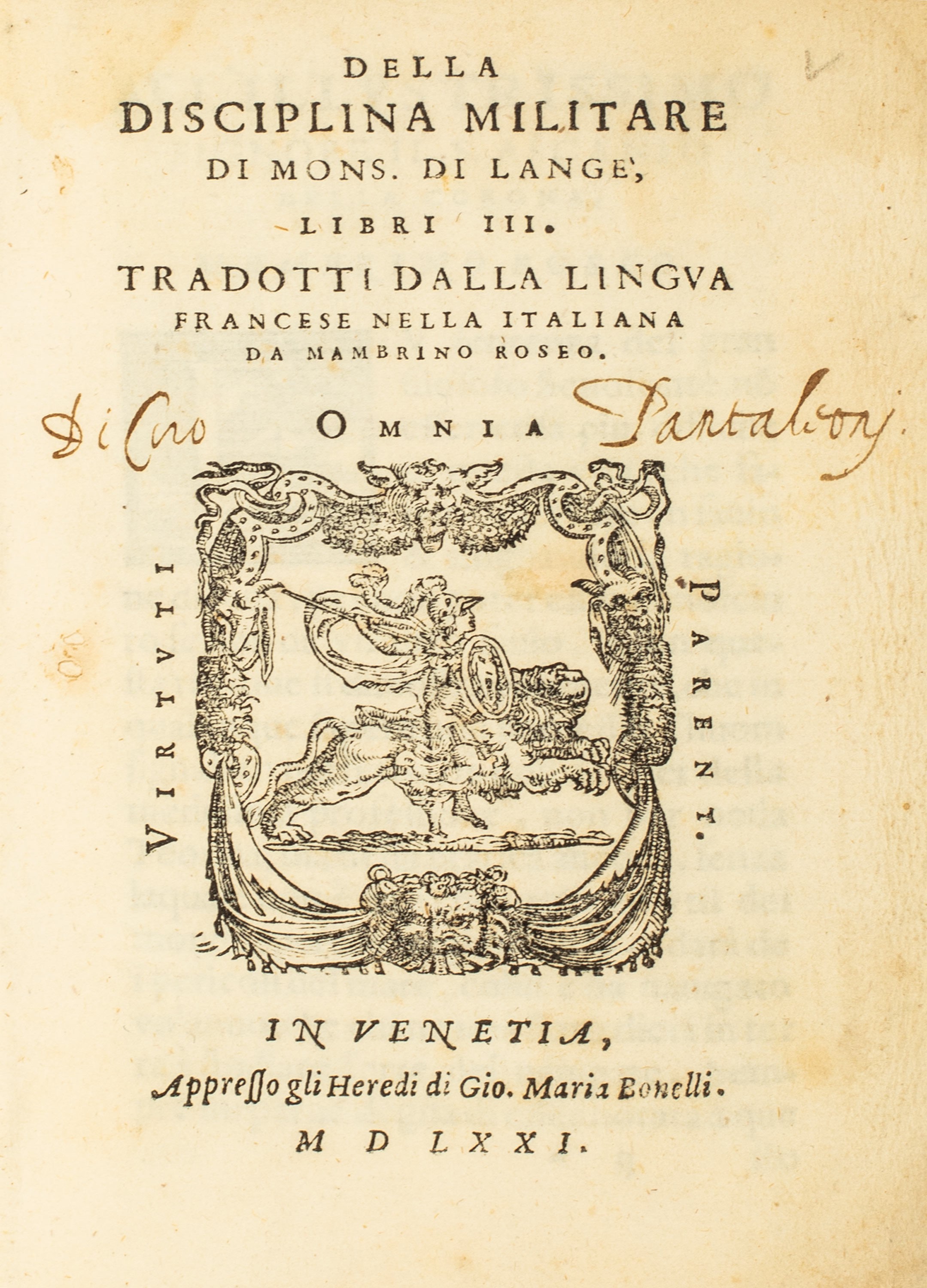 1571 Venezia, eredi di Giovanni Maria Bonelli, 1571. In 8°. Marca tipografica al frontespizio, capilettera xilografici, legatura coeva in pergamena, titolo manoscritto al dorso, uno strappo al piatto anteriore, lacci mancanti. Firma di appartenenza al frontespizio di Ciro Pantaleoni. Ex libris Raccolta d'armi antiche archeologia e numismatica Malfèr Rovereto.