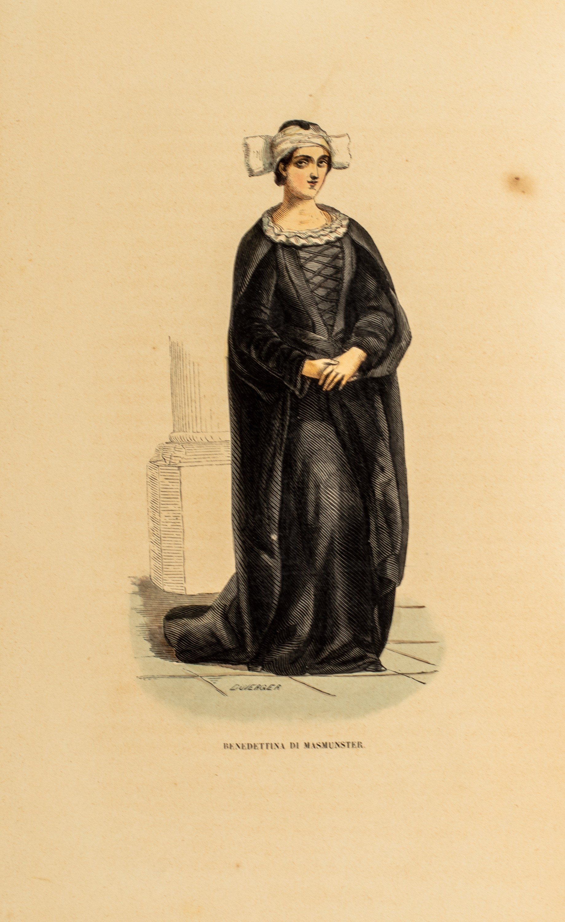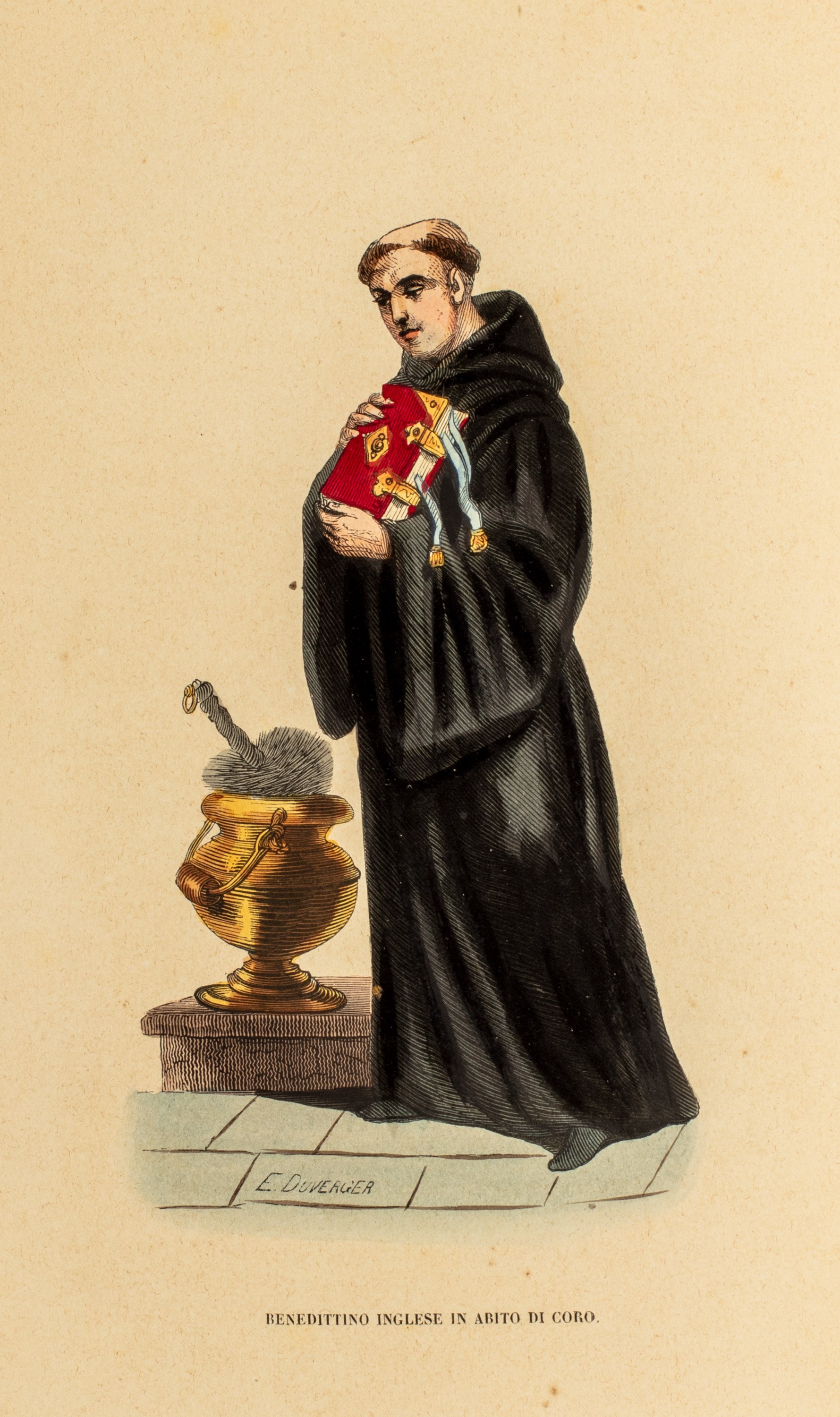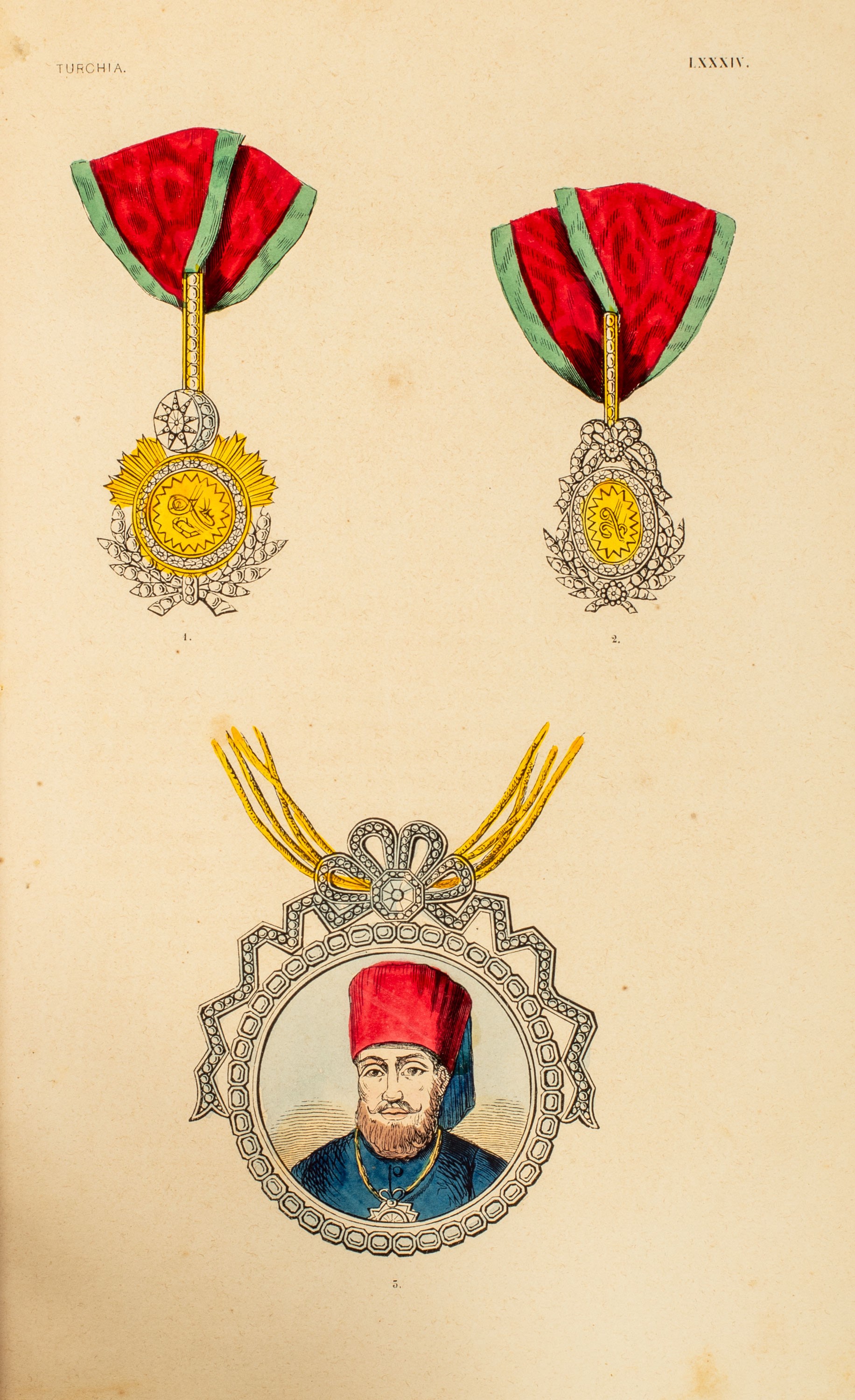 1845 Torino, Stabilimento tipografico Fontana, 1845. In 4°. Solo il vol. primo. Con solo 65 tavole litografiche colorate a mano incise da Duverger, raffiguranti personaggi con i costumi caratteristici dell’ordine di appartenenza. § Descrizione storica degli ordini cavallereschi. Torino, Stabilimento tipografico Fontana, 1846. Solo il primo vol. Con solo 22 tavole litografiche colorate a mano raffiguranti medaglie, onorificenze, stemmi e decorazioni, gore d’acqua, fioriture ed arrossature, medesima legatura in piena pergamena dell’epoca, al dorso tasselli in pelle di diversi colori, autore e titolo impressi in oro, difetti.