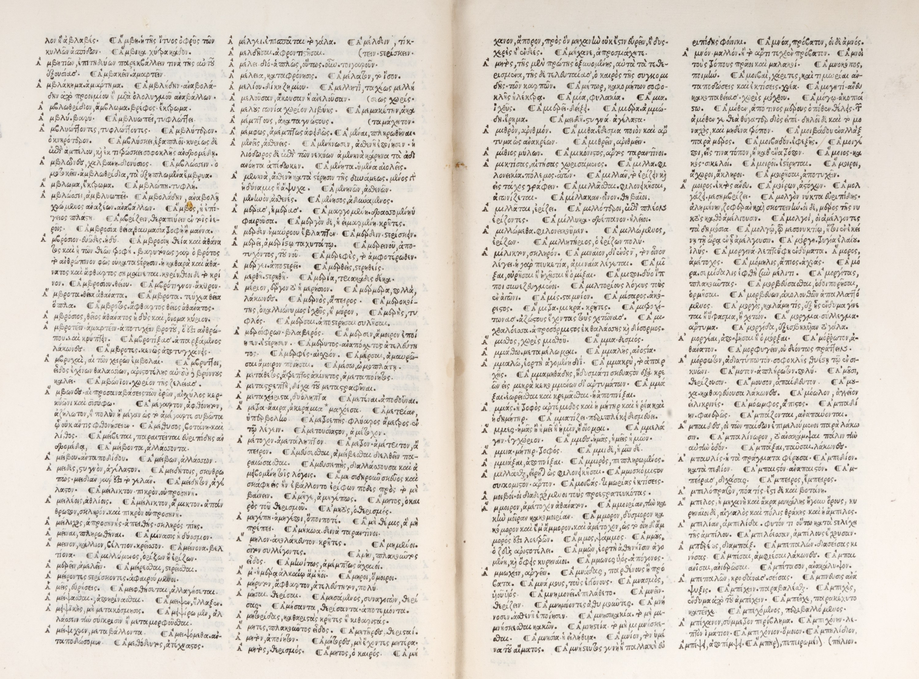 1514 Venezia, in aedibus Aldi et Andreae soceri, 1514. In 2°. Testo dell'introduzione in latino e dell'opera in greco su due colonne, àncora aldina al frontespizio e in fine, spazi per capilettera con letterine guida, primo e ultimo fascicolo rinforzati nel margine interno, ricostruito nel caso di a8, lievi ma estesi aloni di umidità marginali lungo il volume e qualche forellino di tarlo sparso, legatura tardo ottocentesca in pergamena di riuso da antico antifonario, con scritte ormai solo in parte visibili sul piatto posteriore, e dorso rinforzato in carta.