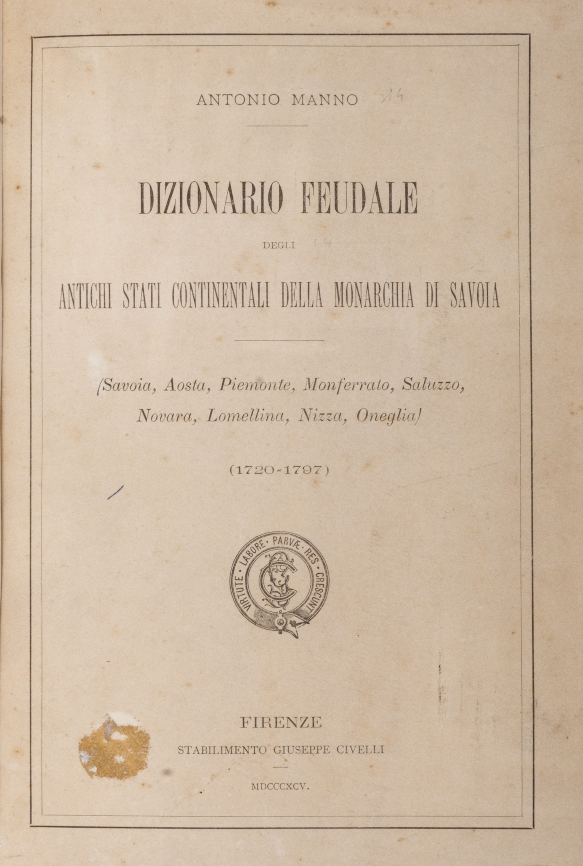 Firenze, G. Civelli, 1895. In 2°. Al frontespizio motto inciso in ovale, fioriture sperse, brossura editoriale conservata in legatura del sec. XX in mezza pergamena.