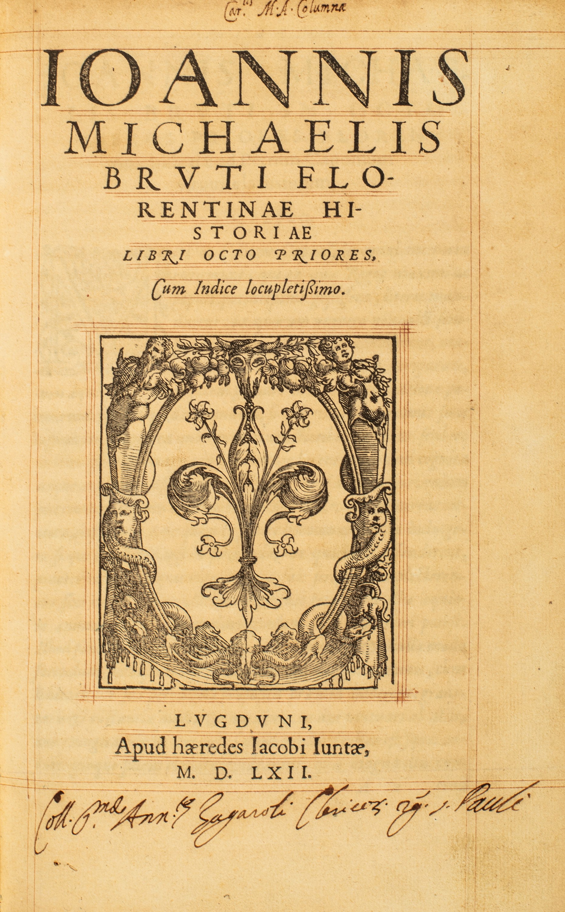 Lione, Eredi Jacopo Giunta (Jacques Faure al colophon), 1562. In 4°. Esemplare réglé, al frontespizio grande marca tipografica in legno, iniziali e fregi xilografici, leggera brunitura uniforme, rare e lievi fioriture, legatura del secolo XIX in mezzo marocchino, al dorso titolo, autore ed eleganti fregi impressi in oro, tagli dorati. Firme di appartenenza al frontespizio.