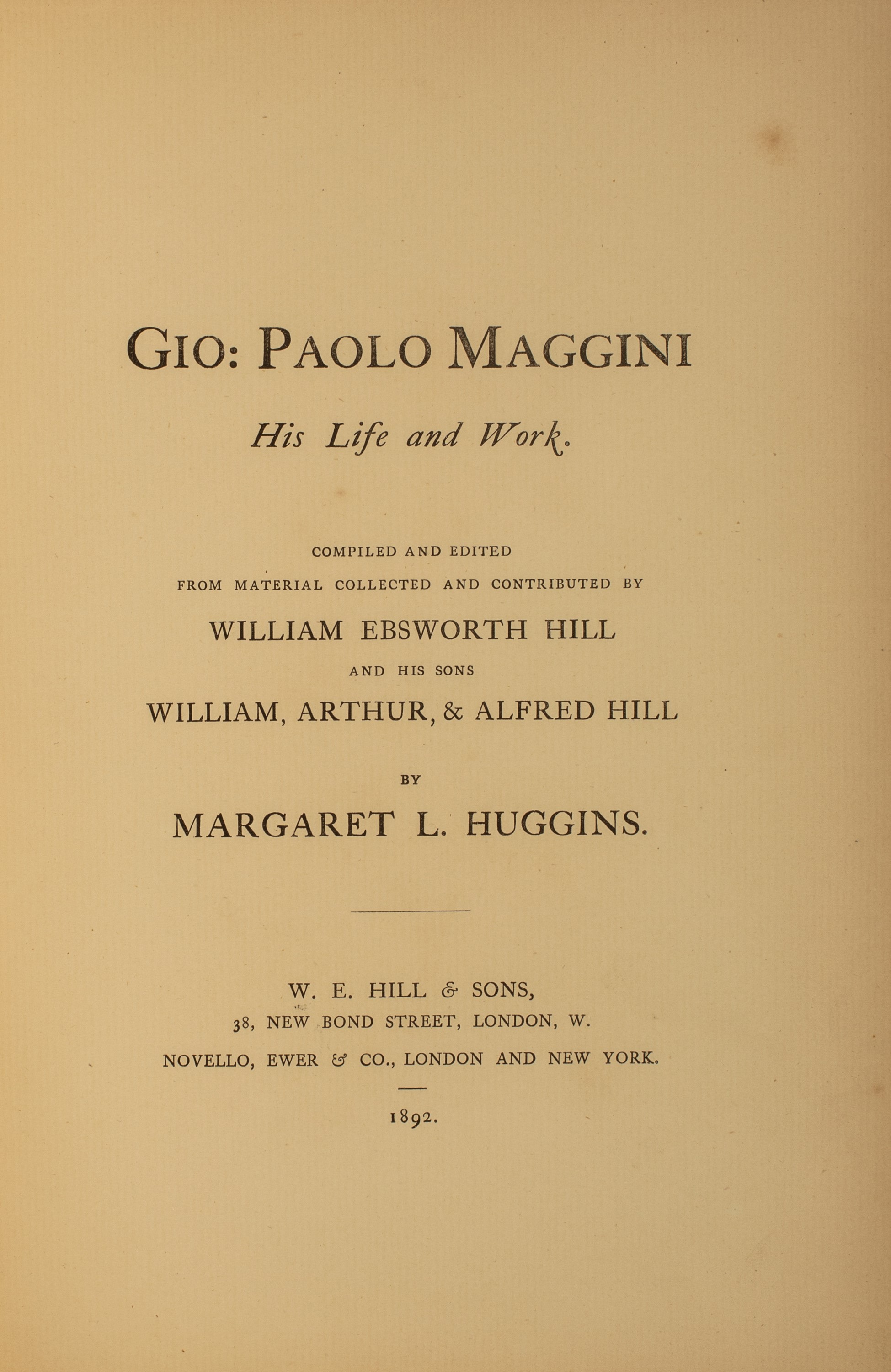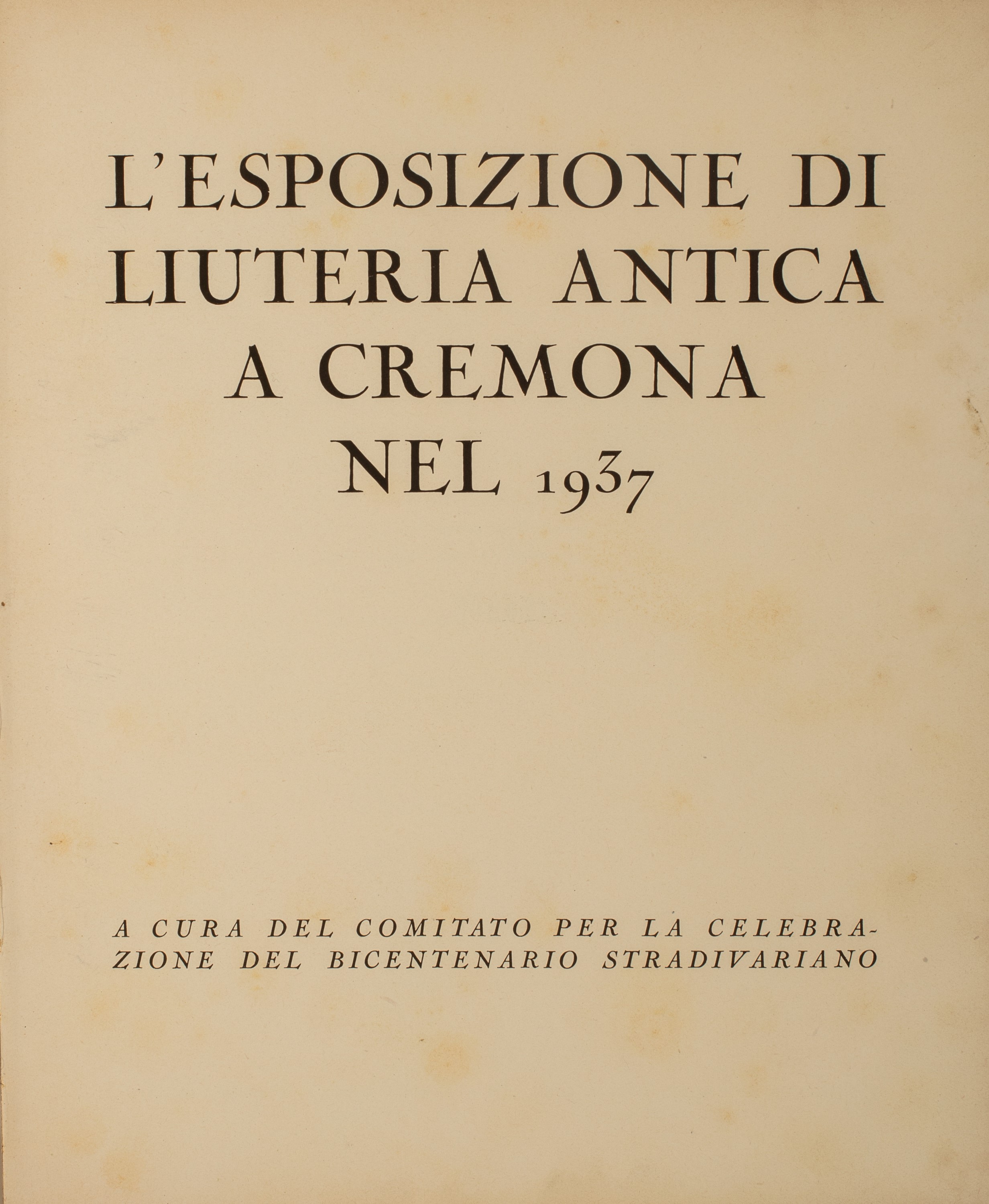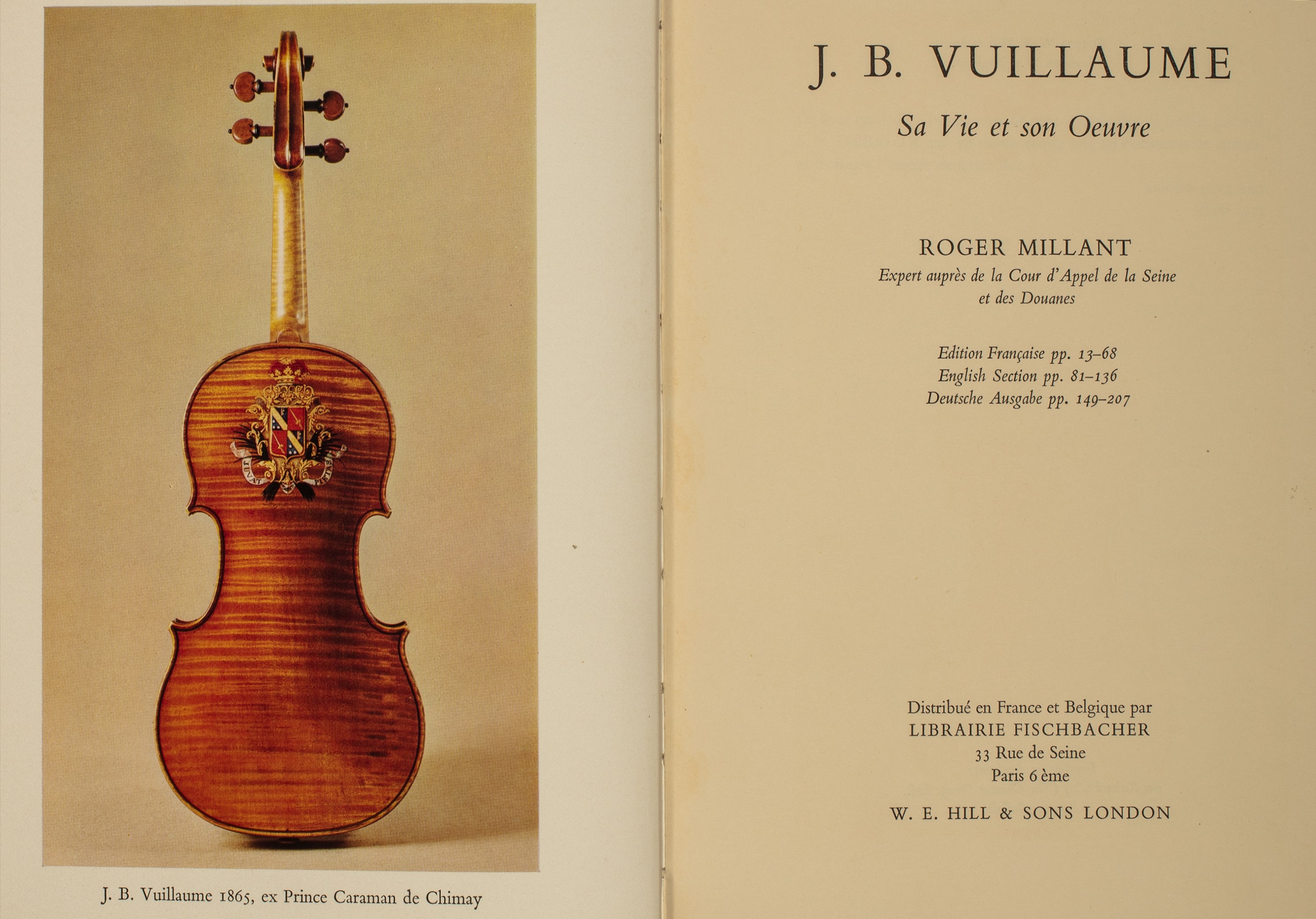1972 Londra, W.E.Hill & Sons, 1892. 7 tavole fuori testo, di cui 2 cromolitografie raffiguranti violini Maggini, legatura editoriale in tela azzurra con impressioni in oro ai piatti. § J.B. Vuillaume & Roger Millant. Sa Vie et son oeuvre. Londra, W.E. Hill & Sons, s.d. [ma 1972]. In 4°. Con 80 tavole a colori ed in bianco e nero, scritto in francese, inglese e tedesco, legatura del sec. XIX in mezza pelle verde, al dorso liscio autore e titoli impressi in oro, al piatto anteriore il nome dell’autore in corsivo in oro; nel lotto anche l’importante catalogo de L’esposizione di liuteria antica a Cremona nel 1937, stampato a Cremona nel 1938, a cura del Comitato per la celebrazione del bicentenario stradivariano, esemplare 102/500.