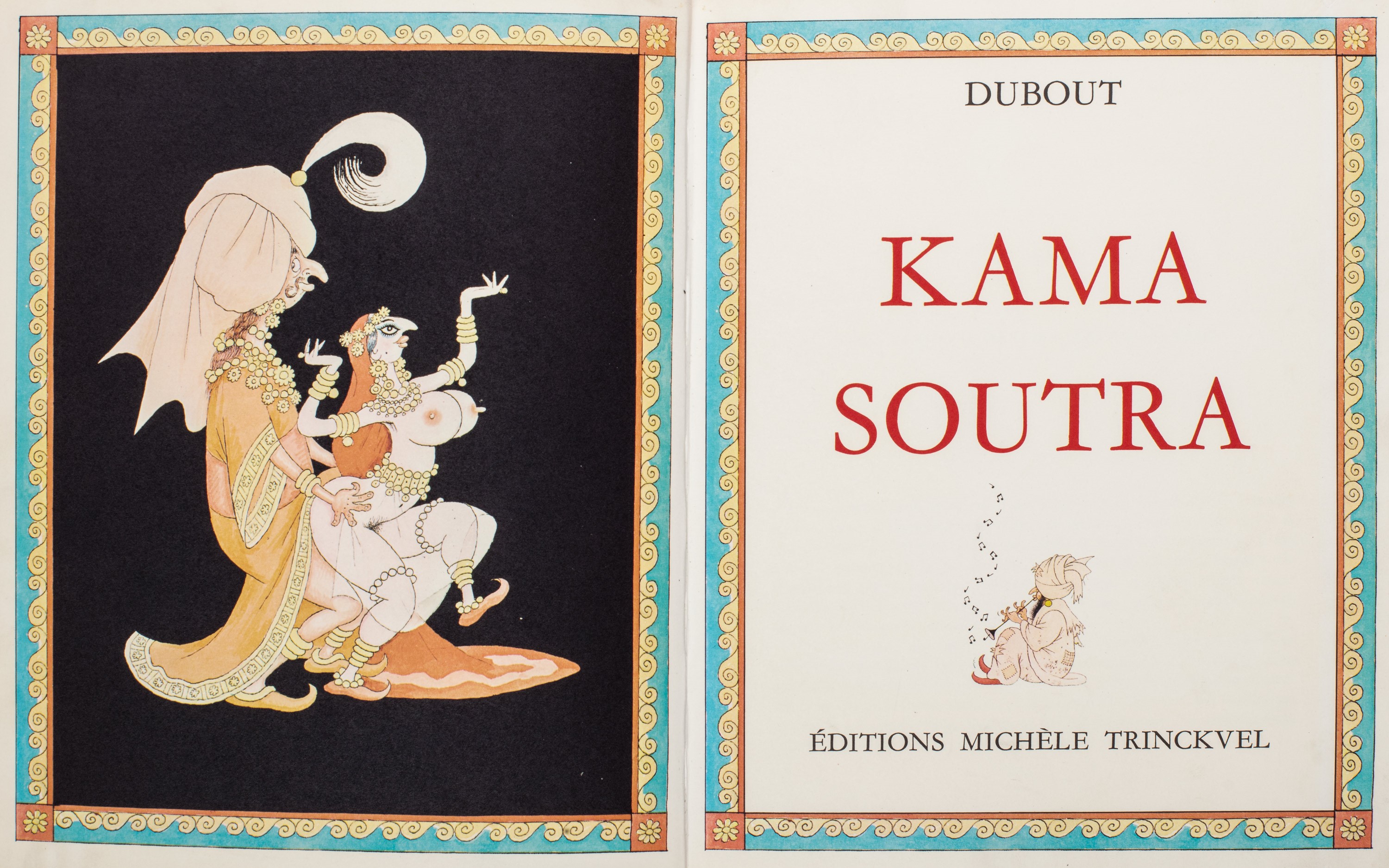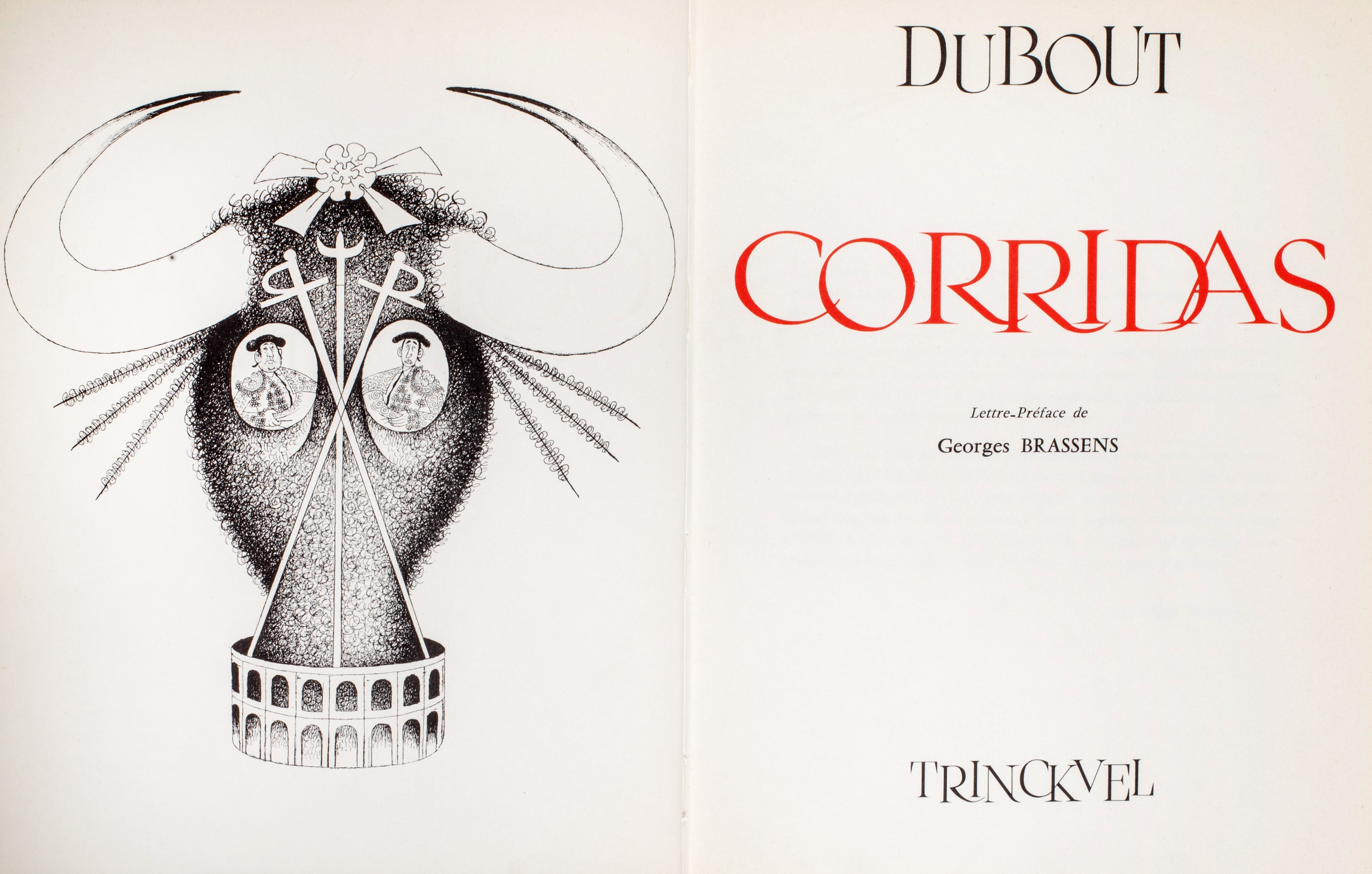 1973 Parigi, Editions Trinckvel,1973. In 4°. Illustrazioni a colori di Dubout, legatura in pelle nera col nome dell'illustratore in oro sul piatto superiore, titolo in oro al dorso, custodia editoriale in carta decorata con la stessa trama delle carte di guardia, lieve scoloritura della custodia. § Insieme nel lotto dello stesso autore Corridas, Parigi, Michèle Trinckvel, 1967. In 4°. Volume di tavole a colori e in bianco e nero con prefazione di George Brassens, legatura editoriale in tela rossa con un toro e una spada impressi in nero e oro al piatto, sovraccoperta illustrata, qualche piccolo strappo e mancanza alla sovraccoperta. § Daudet, Alphonse, Tartarin de Tarascon, Parigi, l'Embleme du Secretaire, 1939. Illustrato a colori da Dubout, legatura coeva in mezza pelle, autore e titolo impressi in oro al dorso.