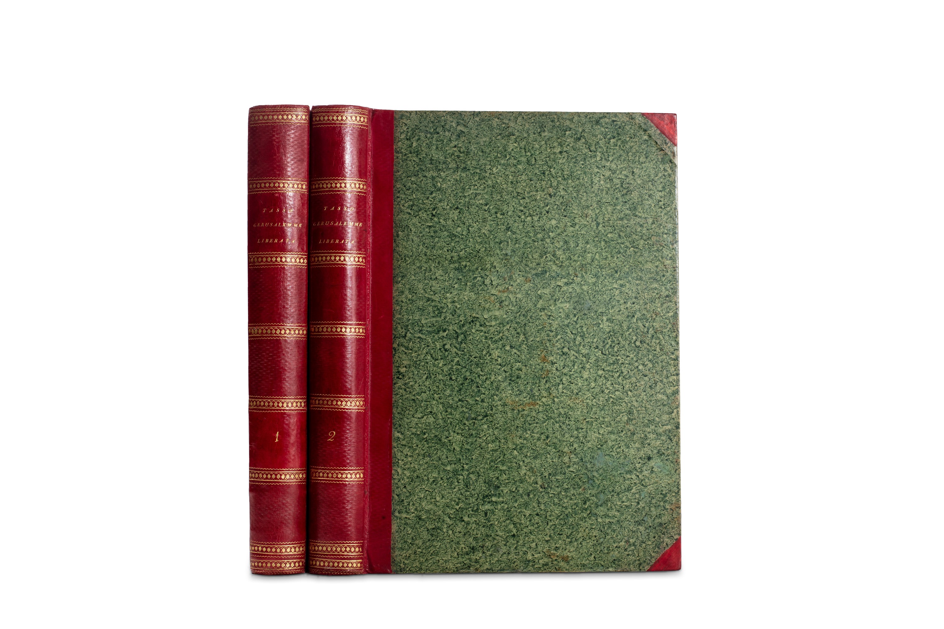1820 Firenze, Giovanni Marenigh, 1820. In 2°. 2 voll. Ritratti incisi in rame da Raffael Morghen dell'autore e del Principe Niccolo Esterhazy, cui e dedicata l'opera, con 20 tavole fuori testo, una per ogni canto, disegnate da Francesco Sabatelli e da Gaspare Martellini ed incise da vari artisti sotto la direzione dello stesso Morghen, rare piccole macchie, legatura in mezzo marocchino rosso, e carta decorata, angoli dipinti in rosso, titolo e autore impressi in oro al dorso liscio con fregi. Ex libris al contropiatto.