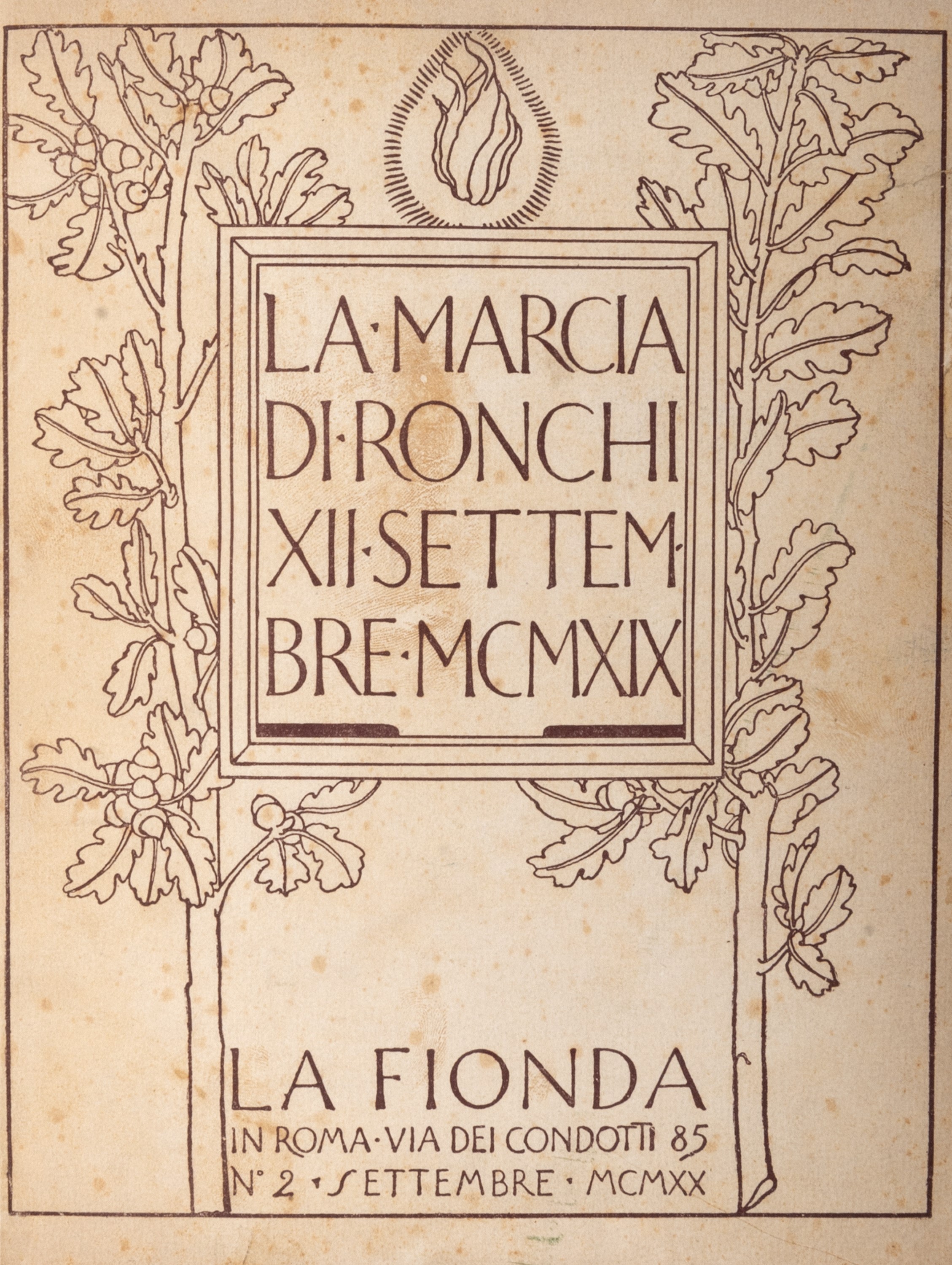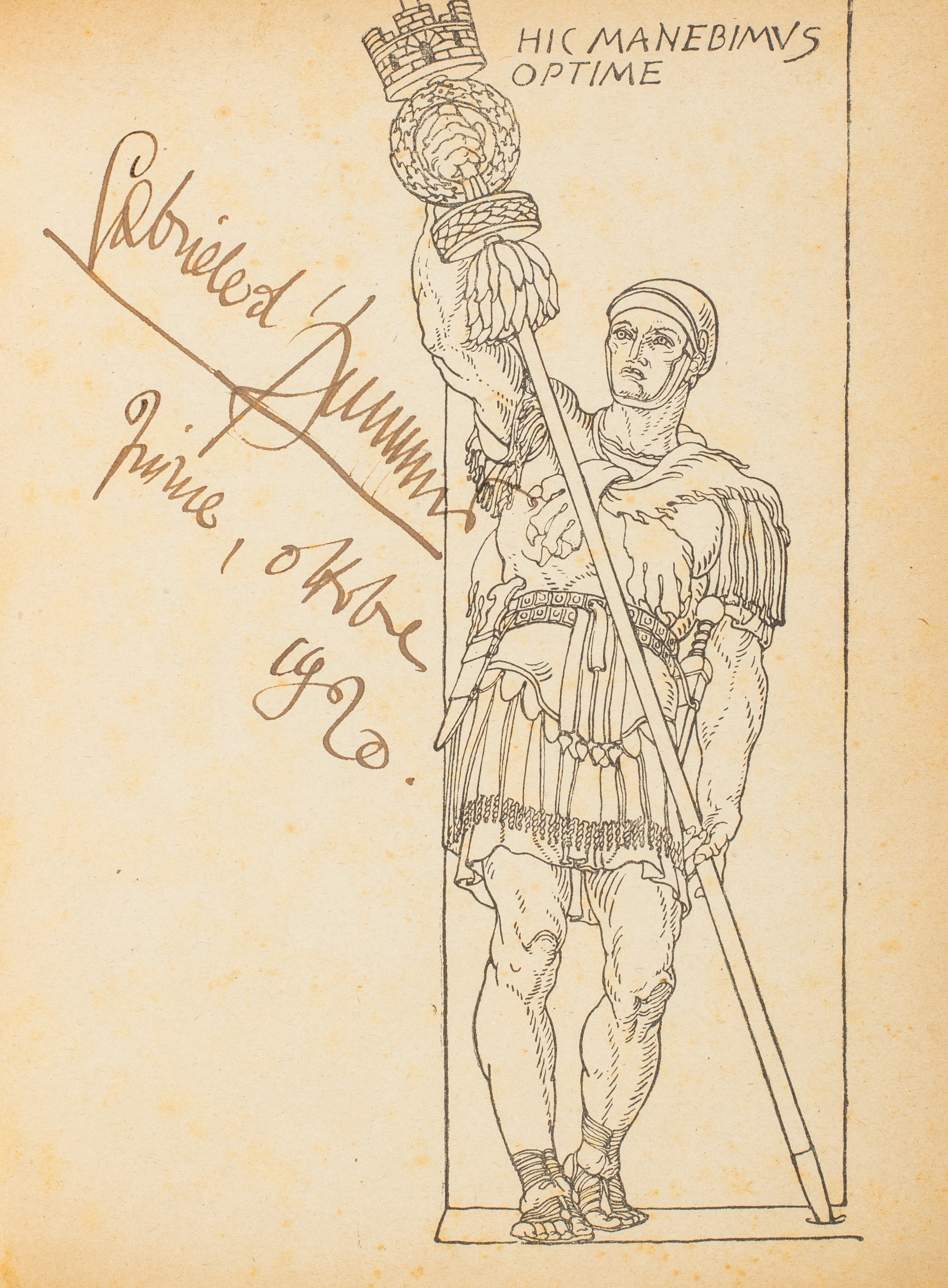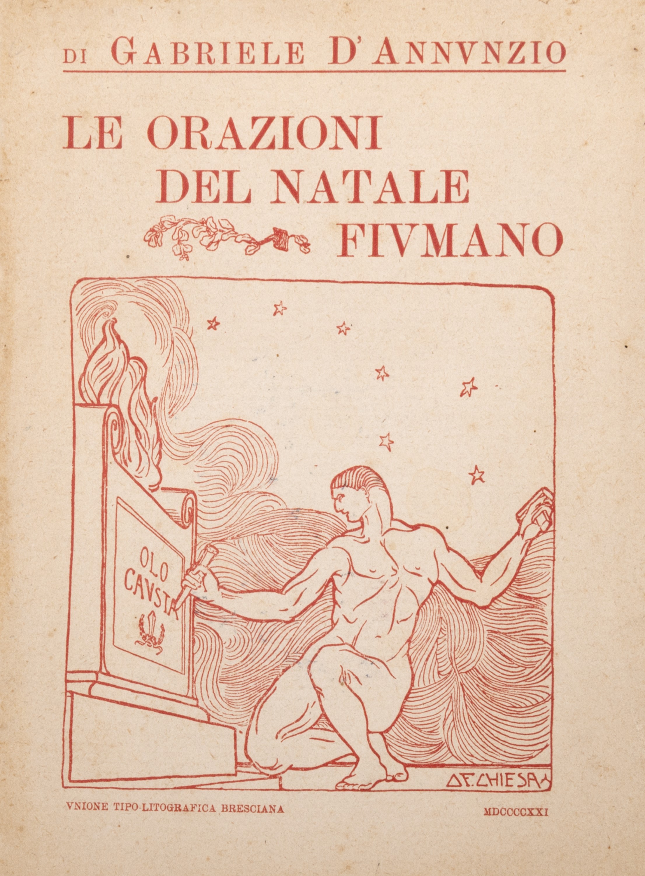 § Le orazioni del Natale Fiumano, Unione Tipo-Litografica Bresciana, 1921.Brossura editoriale illustrata con un disegno a sanguigna su fondo beige di F. Chiesa, motto Quis contra nos? con il simbolo dell'uroboro in quarta di copertina edizione originale. § L'Ala d' Italia è liberata, Roma, La Fionda, 1919, con 2 xilografie di De Carolis, una come testatina e 1 come finalino, 1 facsimile di una lettera di D'annunzio ripiegata fuori testo. Brossura editoriale xilografata da De Carolis, esemplare stampato su carta forte Piccoli difetti.