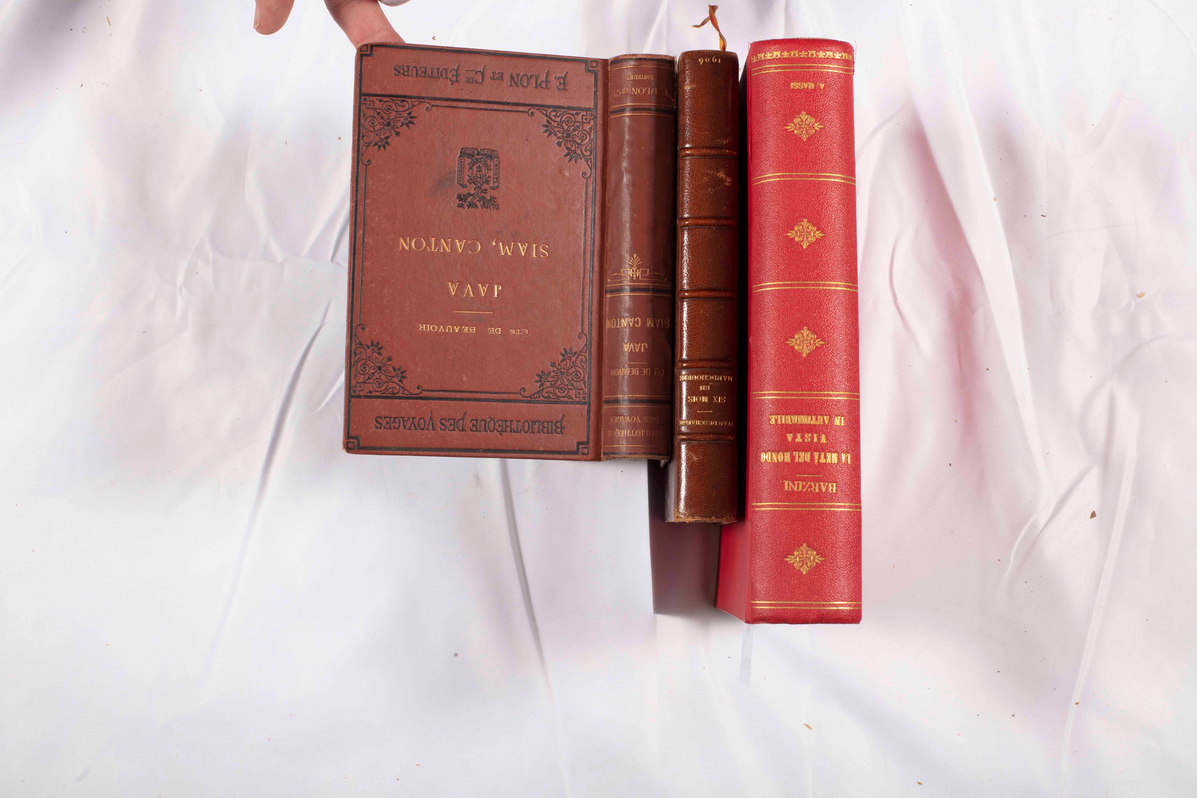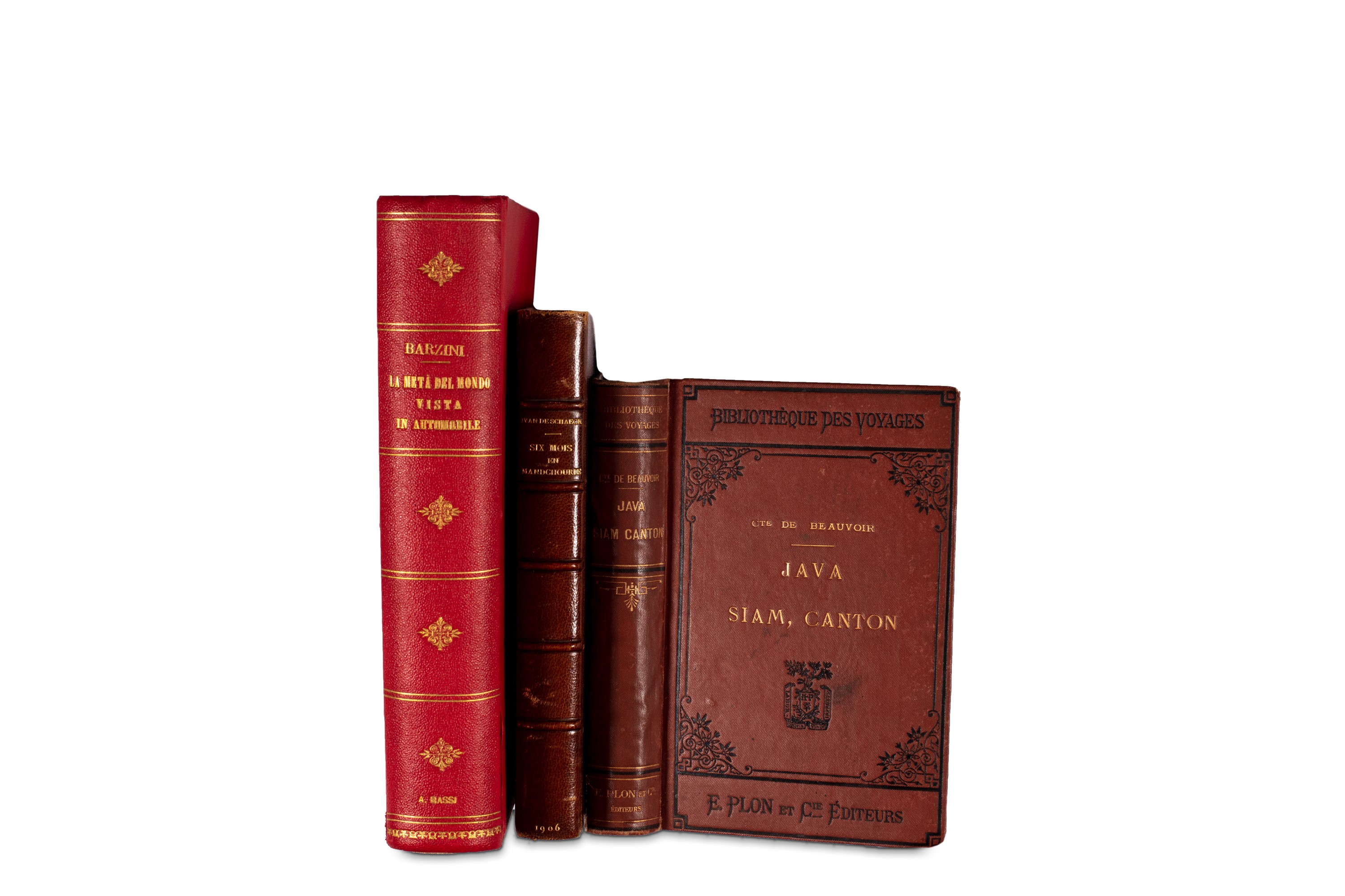 1878 Milano, Ulrico Hoepli, 1908. In 8°. Con 13 tavole, una carta itineraria, 126 illustrazioni originali e l'introduzione del Principe Scipione Borghese, legatura in chagrin rosso, autore, titolo e fregi in oro al dorso, lieve difetto alla cerniera. § Beauvoir, Ludovic C.te de, Java, Siam, Canton. Voyage autour du Monde. Parigi, Plon, 1878. Con 13 tavole in biano e nero fuori testo e una carta itineraria, lievi fioriture e qualche brunitura, legatura editoriale in tela rossa, titolo impresso in oro al piatto anteriore entro elegante cornice con fregi in nero, tagli dorati, lievi segni d'uso. § De Schaeck, Ivan, Six mois en Manduchourie, Parigi, Plon-Nourrit, 1906. In 8°. Con 44 tavole incise fuori testo e una carta itineraria, leggera brunitura marginale, legatura in mezzo marocchino con angoli, autore e titolo impressi in oro al dorso. Dedica autografa dell'autore alla carta di guardia.