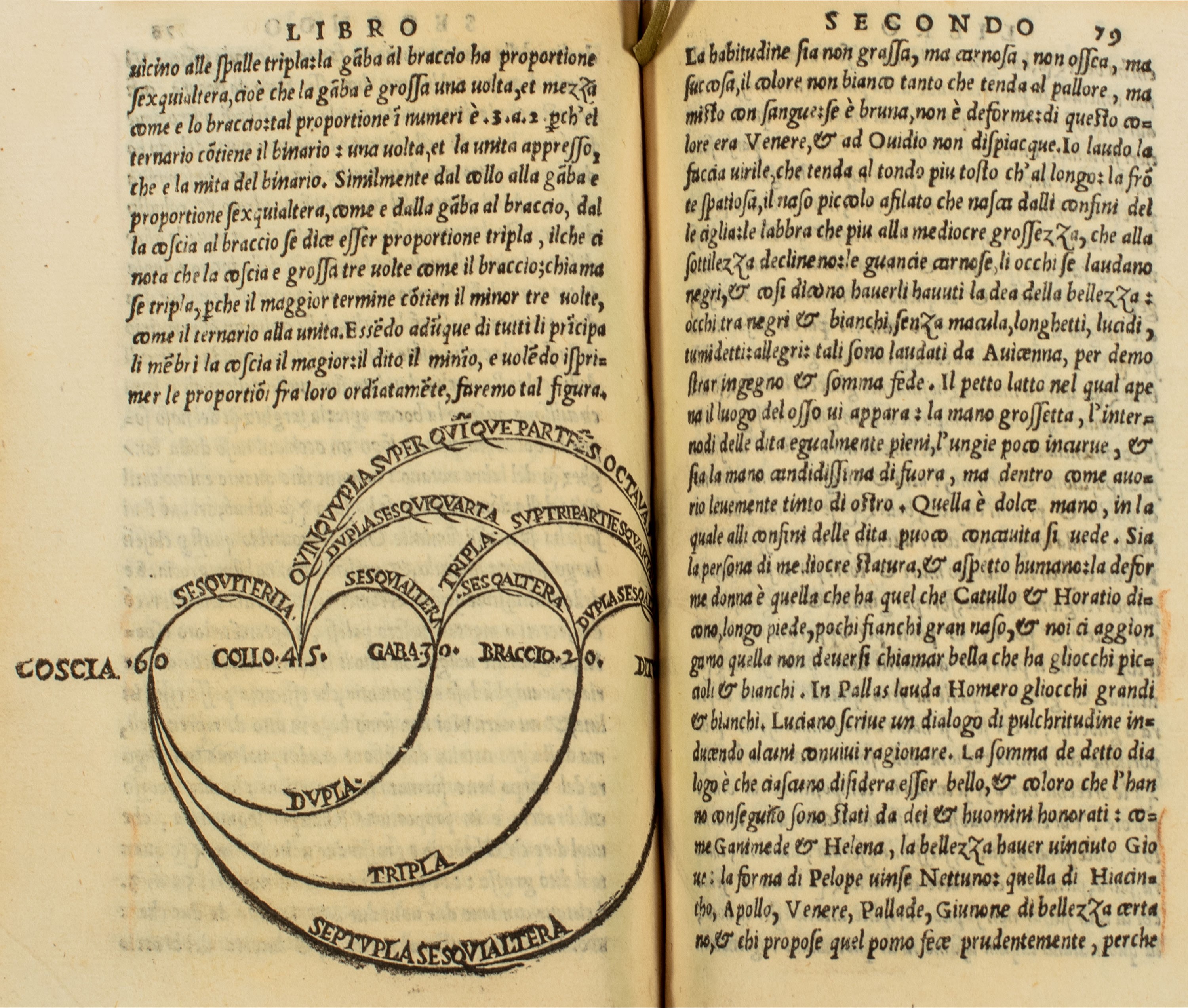 1536 In fine Venezia, Pietro Niccolini da Sabbio, 1536. In 8°. Elegante frontespizio racchiuso entro cornice architettonica figurata incisa su legno, spazi per capilettera con letterine guida, diagramma raffigurante le proporzioni ideali che le varie parti del corpo devono avere tra di loro al verso della carta 78, qualche leggera macchia su poche carte, legatura in mezza pelle marrone del sec. XVIII, dorso a 4 nervi, ai comparti titoli e fregi impressi in oro, tagli rossi, piccoli difetti.