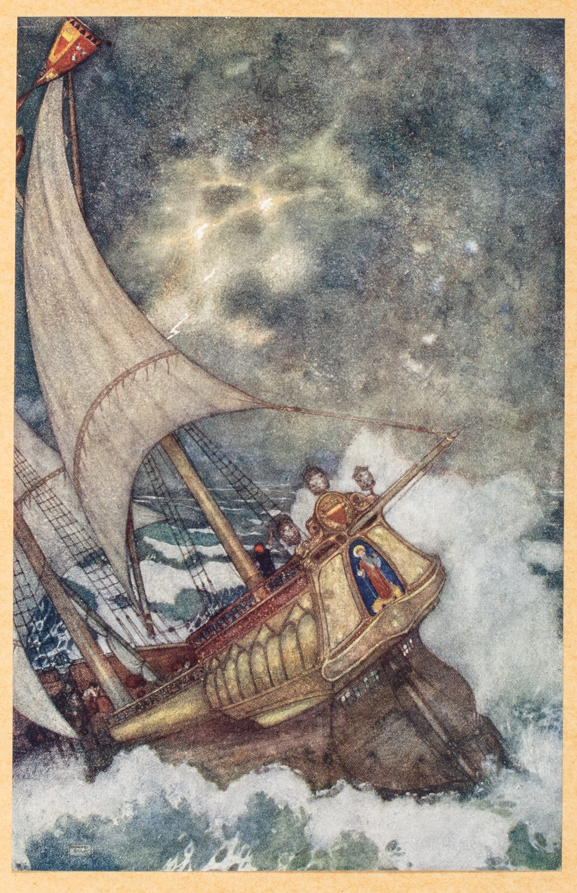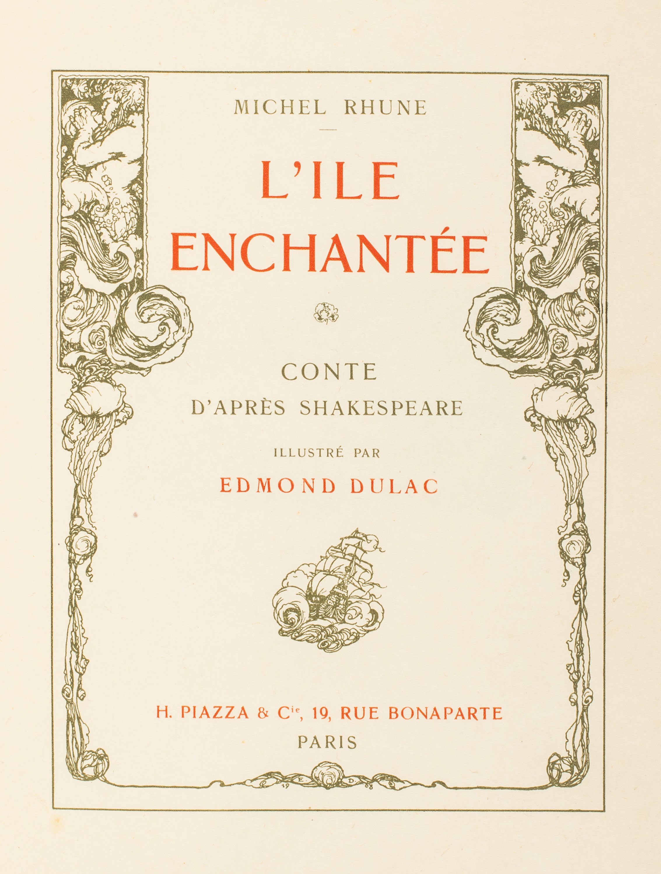 1908 Parigi, Piazza & Cie, s.d. [1908]. In 4°. Con 40 tavole a colori di Dulac applicate su cartoncino, frontespizio in rosso e nero entro cornice, qualche lieve fioritura e brunitura, brossura editoriale e sovraccoperta conservate entro legatura coeva in mezzo marocchino, dorso staccato, lievi difetti.