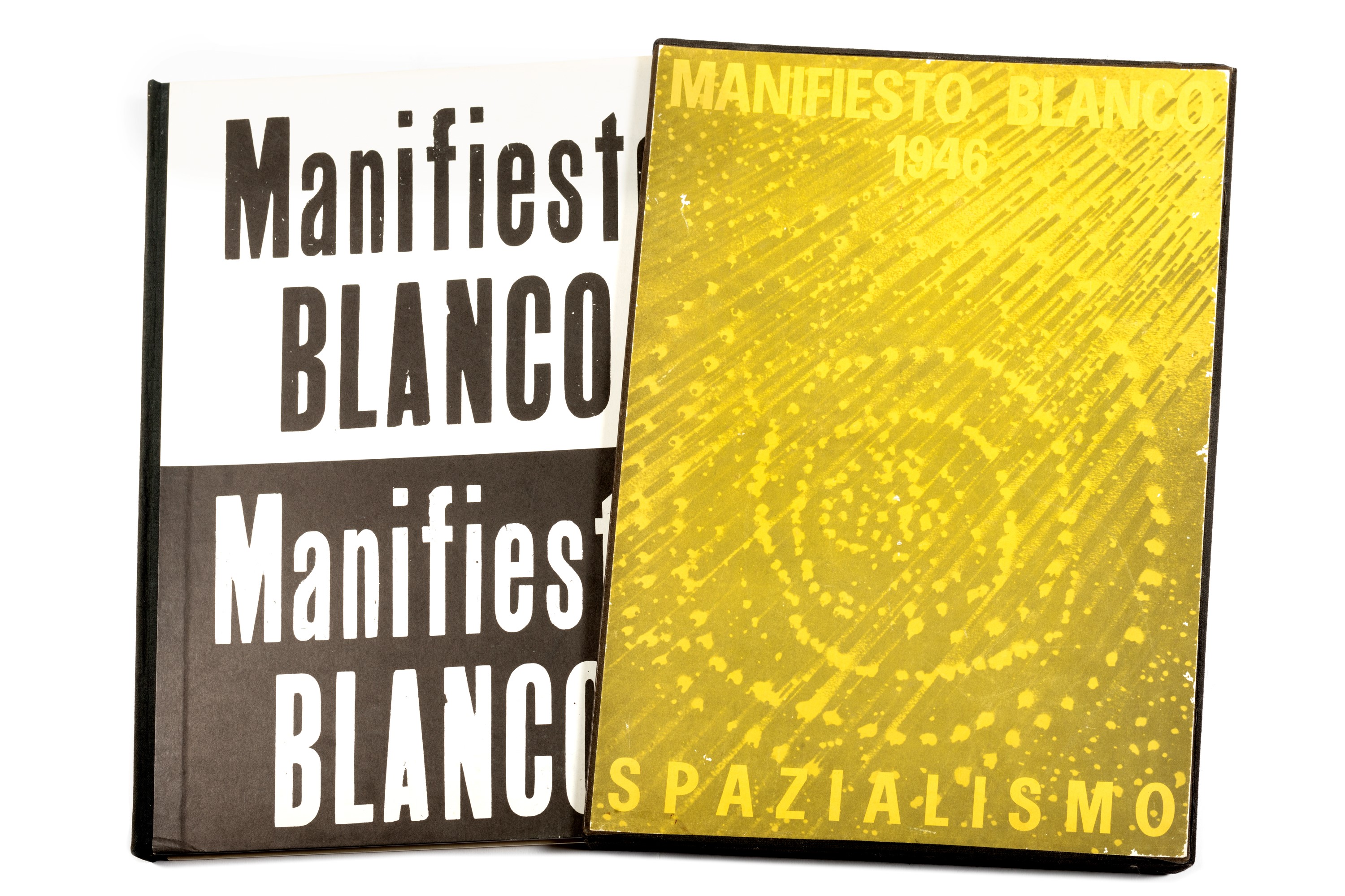 1966 Milano, Galleria Apollinaire, 1966. In 2°. Numerose riproduzioni di opere di Fontana a piena pagina, a colori, con il facsimile del “Manifesto Blanco del 1946 che l’artista aveva elaborato con gli allievi dell’Accademia di Altamira, legatura editoriale in mezza tela nera, al piatto anteriore titolo stampato due volte in bianco e nero, leggera scoloritura all'angolo del piatto anteriore, custodia editoriale in tela nera con il piatto anteriore illustrato, lievi difetti alla custodia.