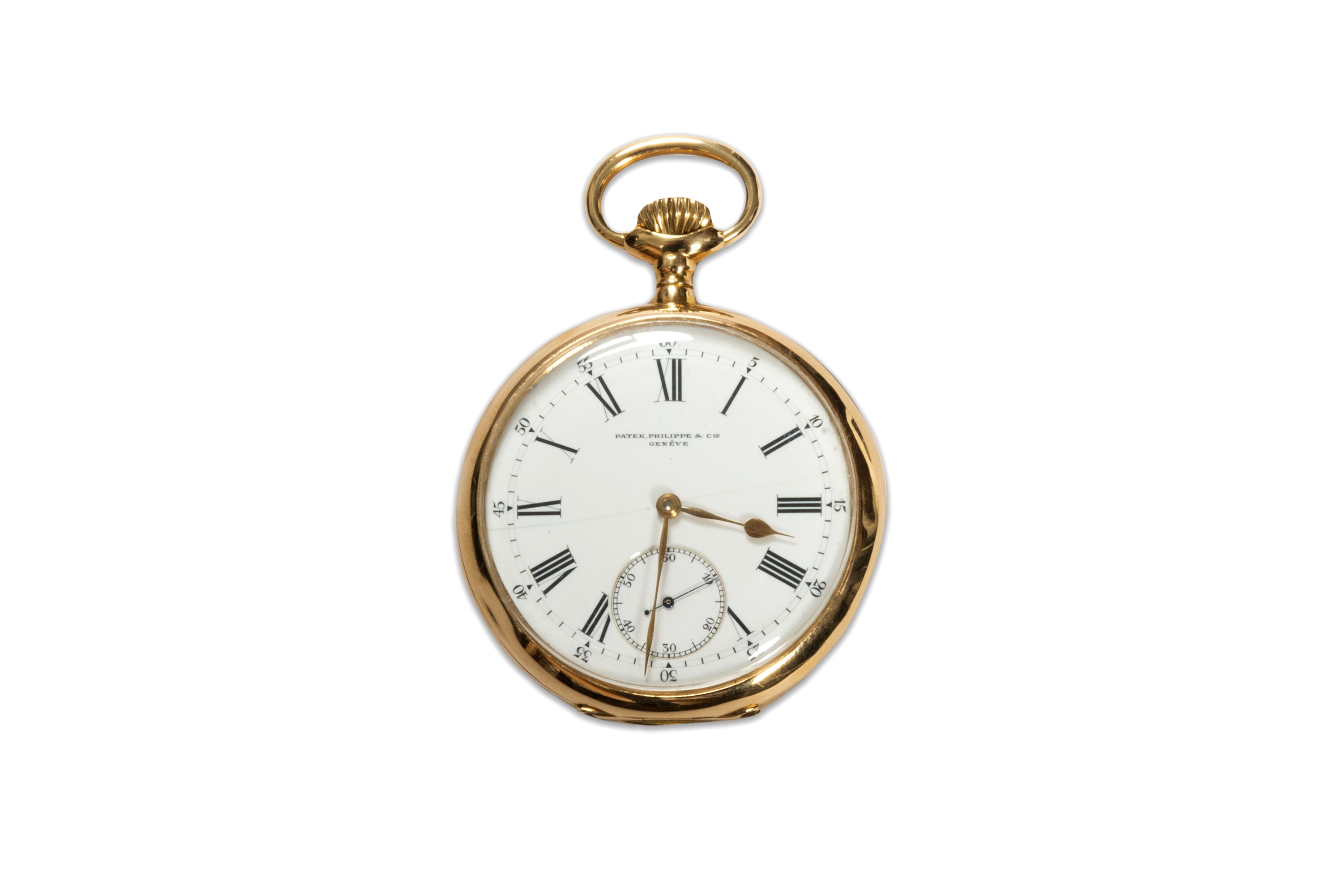 Patek Philippe da tasca, anni ‘20, cassa rotonda in oro 18k, Quadrante in smalto bianco, numeri romani dipinti, Movimento a carica manuale, dimensioni: 52 mm.