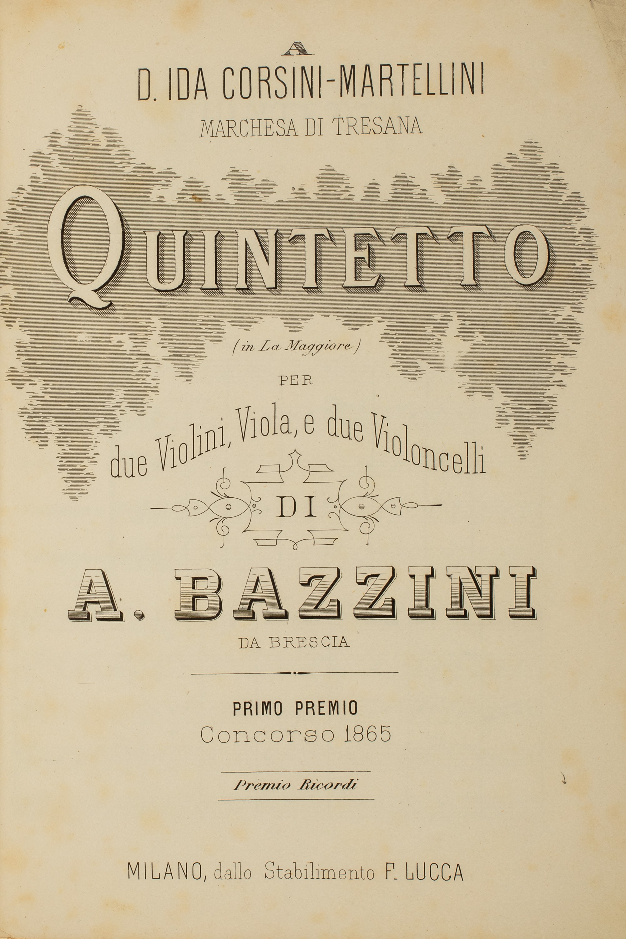 1864 Milano, F. Lucca, [1865]. In 4°. Frontespizio e 95 pagine musicate, qualche arrossatura, piatto anteriore della brossura editoriale conservata, legatura moderna in mezzo marocchino beige. § Quartetto in Do per due violini, viola e violoncello. Milano, Ricordi, [1864]. In 4°. Frontespizio e 50 pagine, medesima legatura del precedente.