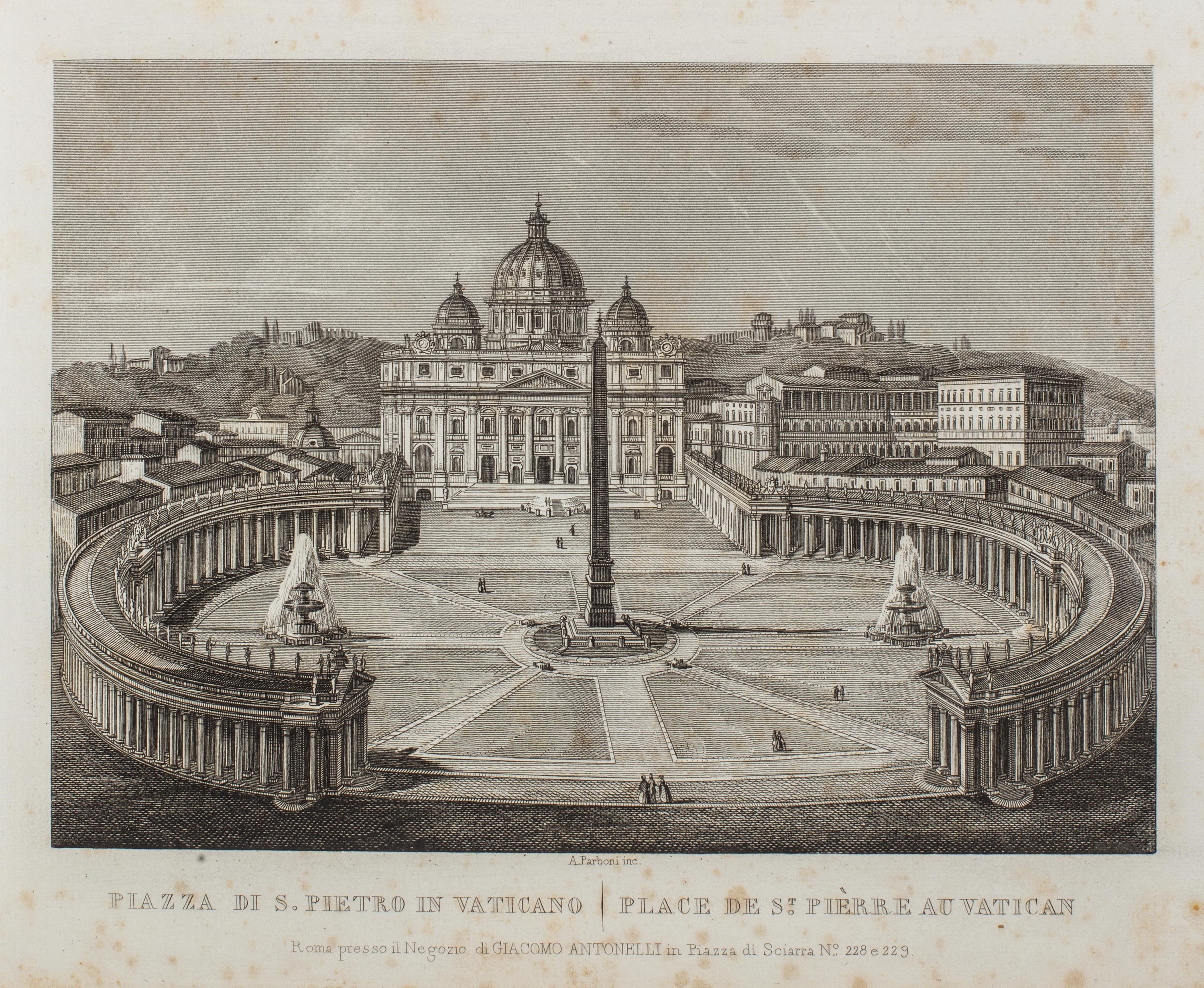 1800 Roma, Giacomo Antonelli, [sec. XIX]. Album oblungo con 49 tavole incise in rame, ciascuna con titolo, lievi fioriture sparse, legatura coeva in chagrin rosso, titolo impresso in oro al centro del piatto con cornice impressa a secco, dorso a 4 nervi, lievi difetti.