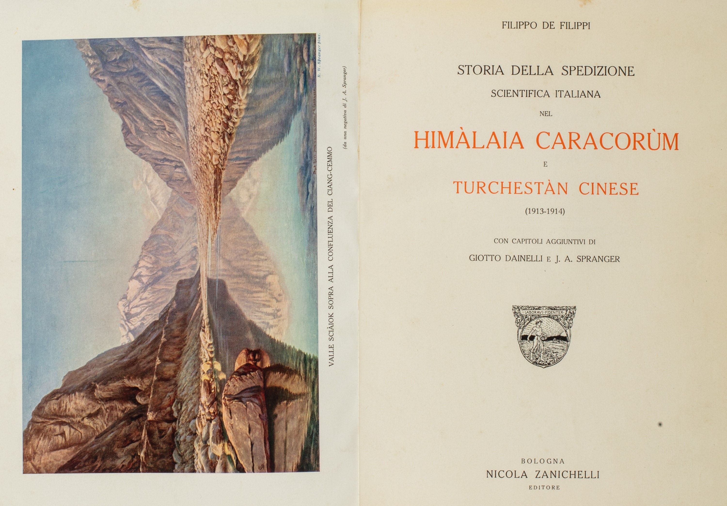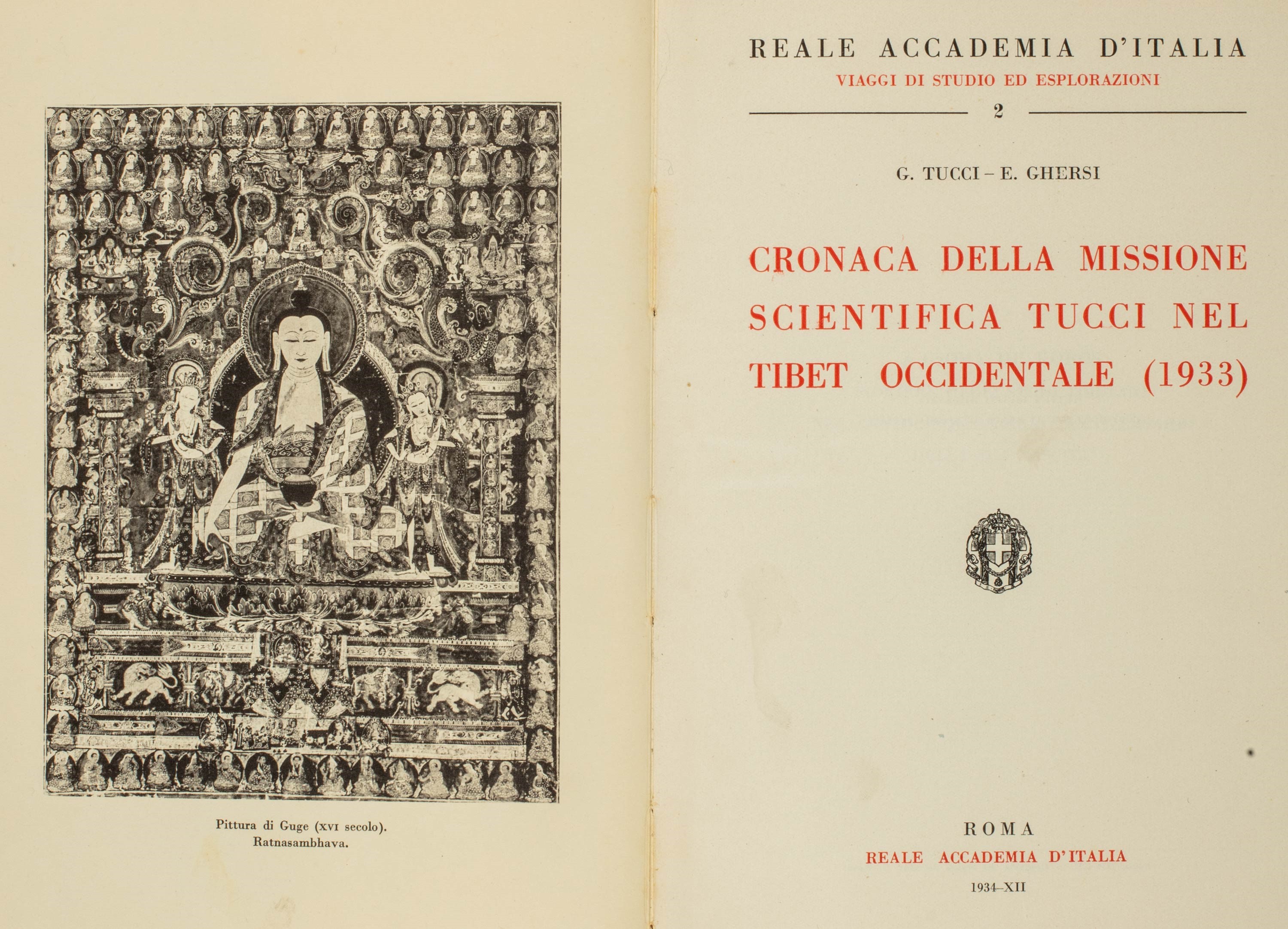 Bologna, Zanichelli, 1924. Con numerose illustrazioni e tavole fuori testo, nella tasca al contropiatto 8 tavole sciolte in fototipia di panorami e carte geografiche, lievi fioriture, legatura coeva in mezza pergamena e chagrin rosso, autore e titolo impressi in oro entro tassello al dorso, lievi difetti, piccola mancanza al tassello. § Insieme nel lotto Tucci, Giuseppe.; Ghersi, Eugenio., Cronaca della missione scientifica Tucci nel Tibet occidentale (1933), Roma, Accademia d'Italia, 1934. Con numerose illustrazioni in bianco e nero nel testo, due tavole di carte geografiche ripiegate in fine al volume, lievi fioriture, brossura editoriale in cartoncino, titolo in rosso e nero al piatto anteriore, mancanze al dorso, parzialmente staccata dal corpo del libro, sovraccoperta in finta pelle.