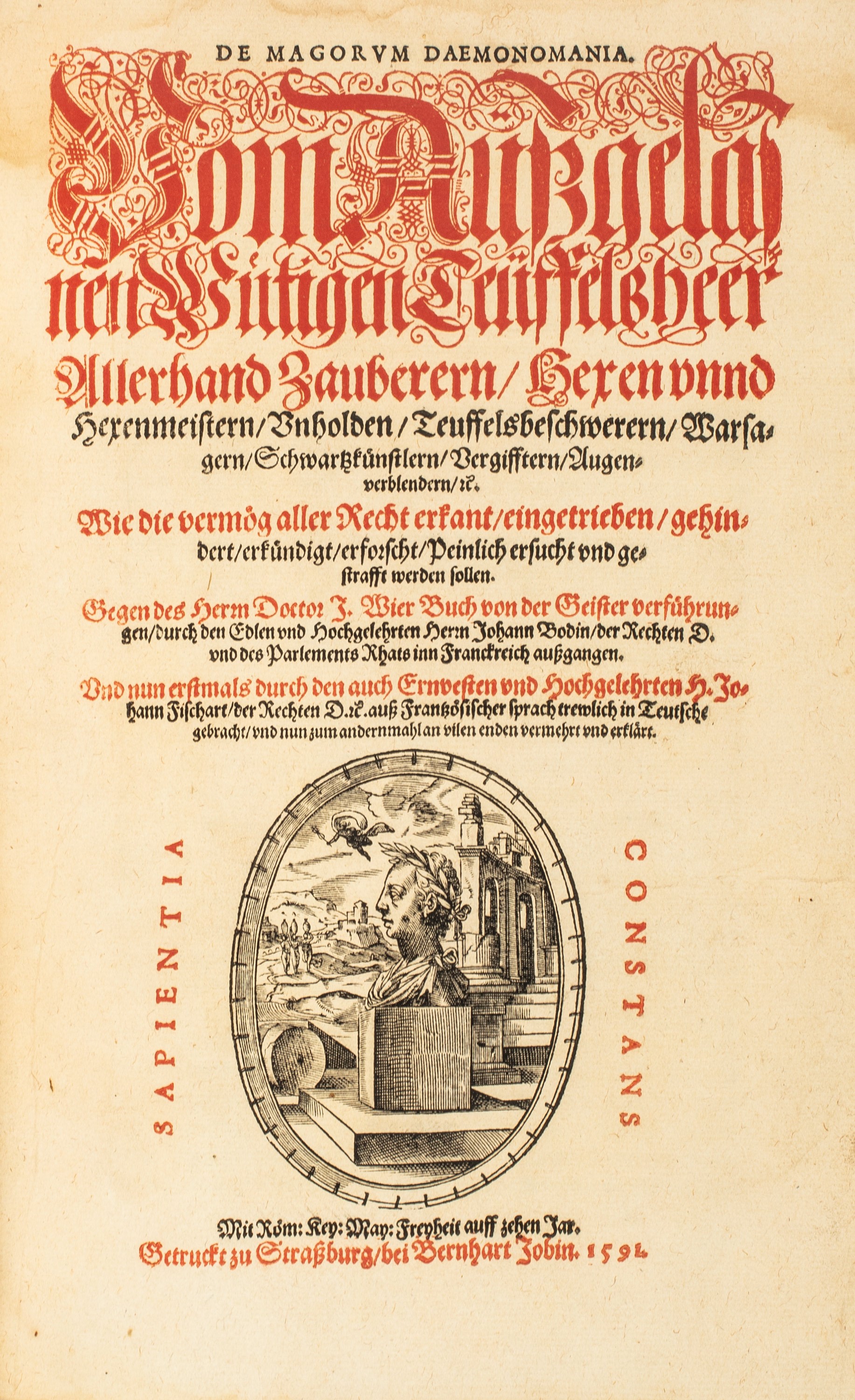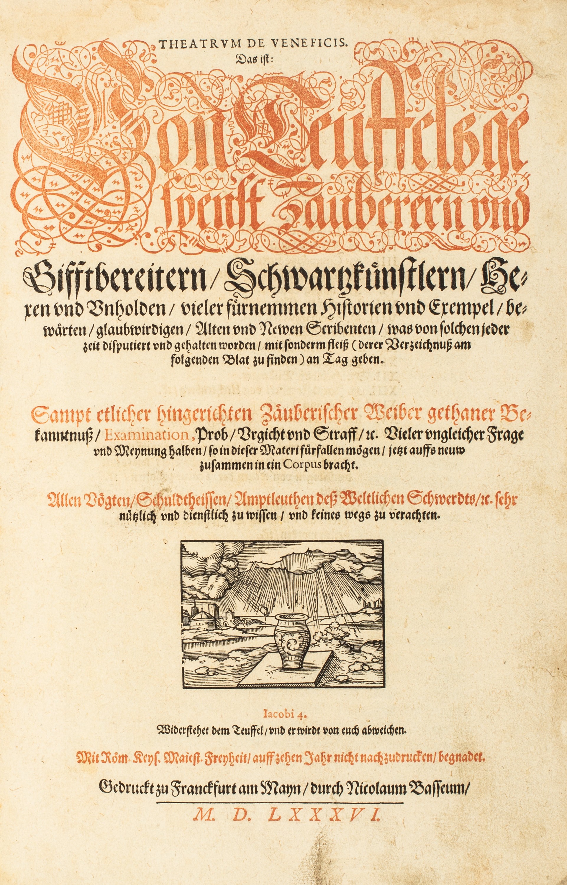 Francoforte, N. Basse, 1586. In 2°. Frontespizio stampato in rosso e nero con vignetta allegorica xilografica, capilettera ornati, marca tipografica al recto della bianca finale. Legato con Bodin, Jean. De magorum Daemonomania Vom Ausgelassnen wutigen Teuffelsheer, allerhand Zauberern, Hex und Hexenmeistern... Strasbourg: B. Jobin, 1591. Frontespizio stampato in rosso e nero con ritratto in ovale. Legato con Wier, Joannes. De praestigiis Daemonum. Von Teuffelsgespenst Zauberern und Gifftbereytern, Schwartzkunstlern, Hexen und Unholden... Francoforte, N. Basse, 1586. Frontespizio stampato in rosso e nero con vignetta allegorica xilografica, esemplare con macchie di umidita e brunitura uniforme, legatura originale in pergamena, dorso a nervi, titolo della prima opera manoscritto ad un comparto, tracce di lacci al piatto anteriore, macchie e piccoli fori di tarlo, lievi difetti.