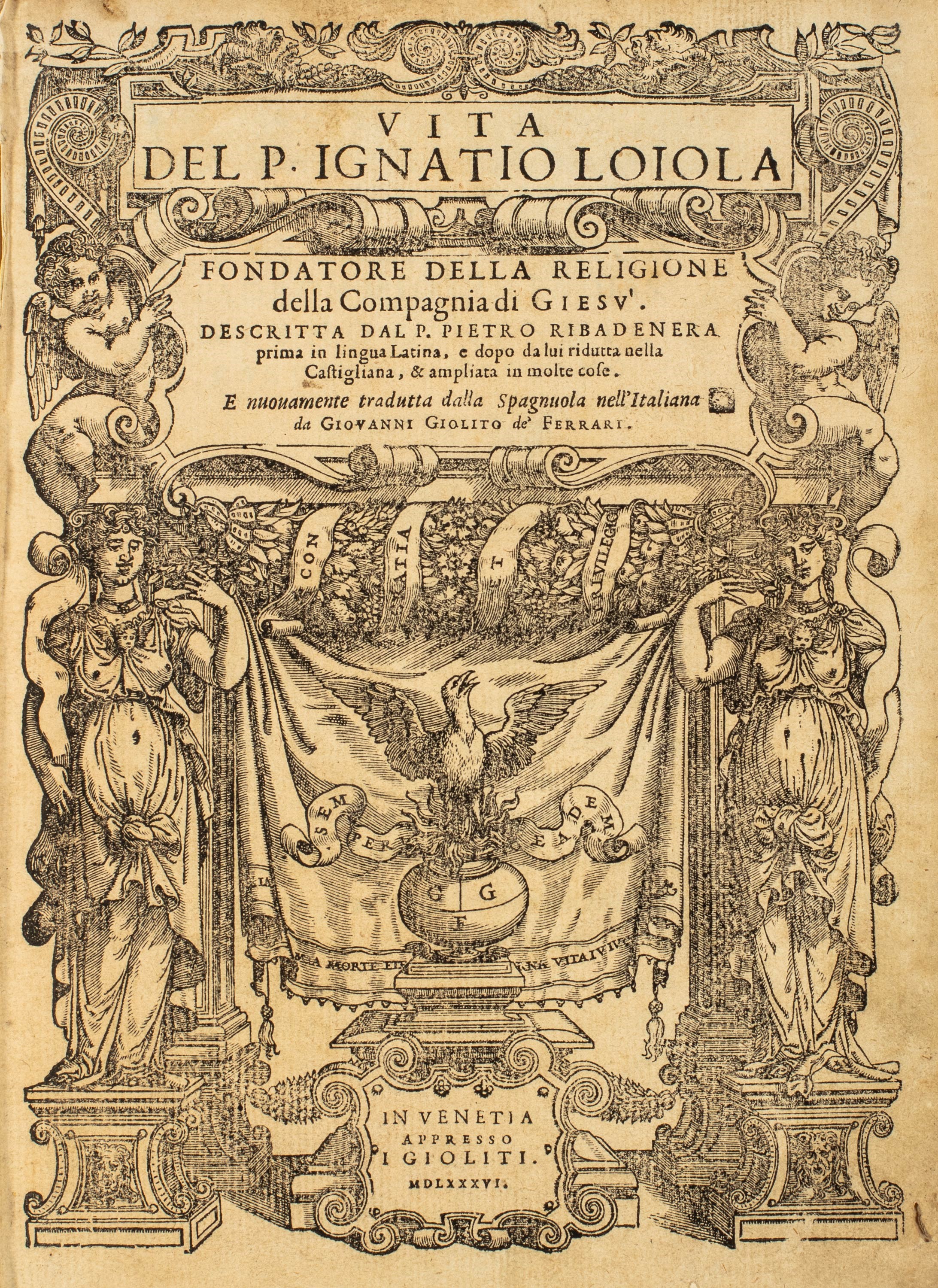 1586 Venezia, G. Giolito, 1586. In 4°. Frontespizio figurato xilografico con cornice decorata, marca tipografica con la Fenice, ritratto di Ignazio di Loyola al verso della carta a22, leggere bruniture e fioriture, lieve gora d'acqua al margine superiore, legatura coeva in pergamena, tagli a spruzzo blu, lieve difetto alla cerniera interna, piccola mancanza restaurata nella parte inferiore, tracce di tassello al dorso, lievi difetti.