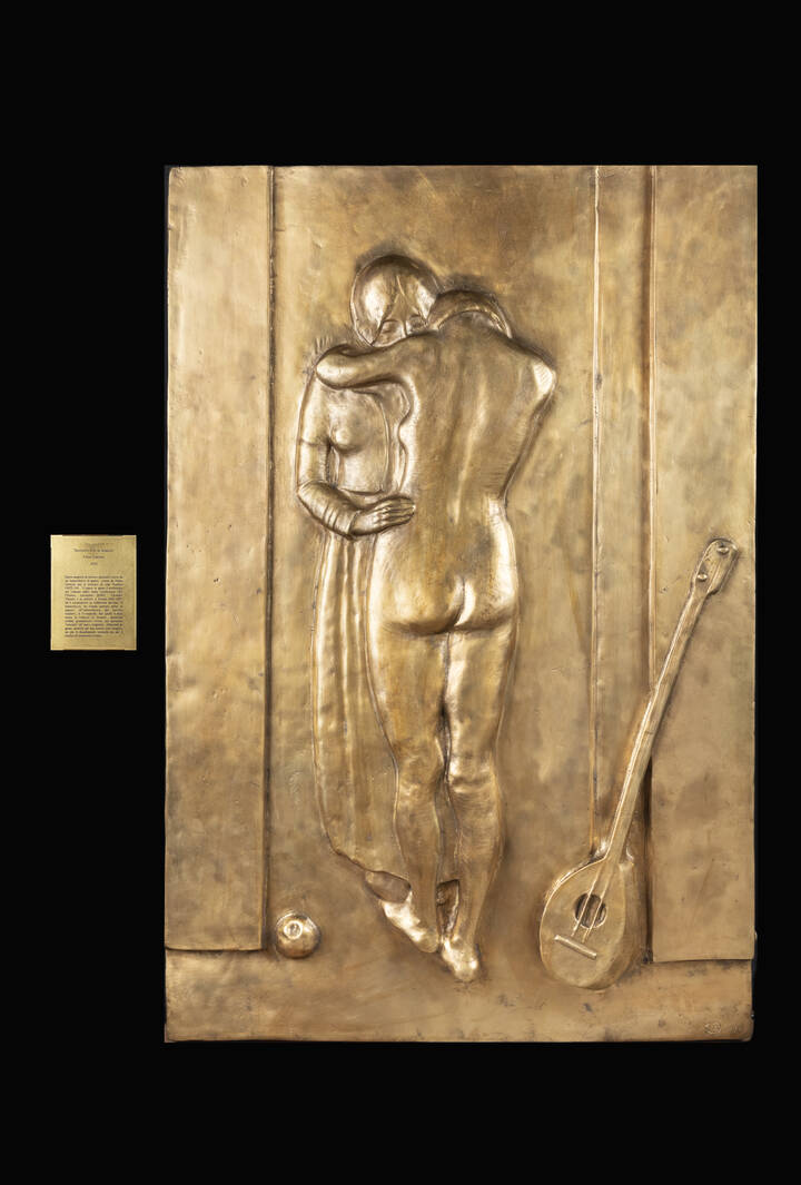 140x92 5 bassorilievo in bronzo a cera persa es. III/VI Opera siglata e numerata in basso a destra; sul bordo esterno destro in basso è presente un quadratino in bronzo recante impronta digitale di Francesco Casorati Autentica su fotografia di Francesco Casorati rilasciata a Torino il 22/12/03 e registrata con il numero 1167 Archivio Francesco Casorati Torino. Bib.: - Catalogo generale delle opere di Felice Casorati vol. III n. 36SC. pag. 69 pubblicata b/n tavola fuori testo. Allegata all'opera dichiarazione manoscritta del Professor Francesco Poli: Torino 25/1/22/ In relazione alla scheda n. 36 sc del catalogo/ generale delle opere di Felice Casorati volume III si precisa quanto segue: i bassorilievi in bronzo/ tiratura postuma sono in sei esemplari/ segnati in numeri romani e non come/ erroneamente indicato sulle schede in numeri/ arabi./ Le dimensioni indicate nelle schede fanno/ riferimento a quello del gesso originale/ da cui sono tratte le opere in bronzo e/ quindi sono leggermente più piccole/ Francesco Poli. Provenienza: opera acquistata direttamente da Lazzarini Arte & Antiquariato Torino. I bassorilievi del teatro Gualino Fu un atto di coraggio quello di concedere carta bianca a un pittore perché facesse dell'architettura. Io speravo che appunto perché immune dalle regole della tradizione Casorati avrebbe risolto in modo originale il problema. La mia aspettativa non andò delusa. La sala è rettangolare di colore grigio; il soffitto semplice a sagome angolari. Una fascia di circa un metro di altezza fra pareti e soffitto avente una serie di bassorilievi illuminati da luce nascosta è la nota decorativa dell'ambiente e in pari tempo l'unica sorgente luminosa. Cento seggioloni di legno nero lucido con cuscini grigi salgono a scalinata; il velario è di panno grigio filettato di rosso; ai lati del boccascena due piedistalli scarlatti sostengono due statue grigie del Casorati. Il pavimento nero completa l'armonia in grigio-nero-rosso. Il teatrino comunicava colla mia abitazione che presentava grande interesse per la collezione di oggetti d'arte disposta ogni anno in modo differente. Unica luce era quella proveniente dagli oggetti illuminati cosicché si attraversavano le sale fra gli sguardi di Antonello o di Tiziano di Cimabue o di Botticelli tra smalti e ceramiche tra statue cinesi e sculture romaniche. Dopo lo spettacolo gl'invitati solevano dal teatrino recarsi in casa a trascorrervi un'ora; nulla sembrava loro più interessante del mutamento radicale del passaggio repentino dall'emozione dello spettacolo presentato nella sala del teatrino lucida e austera alla visione del passato sintetizzata da pochi capolavori opportunamente messi in rilievo. L'accesso al teatrino ricavato in piccolo vano con giuoco audace di grossi archi e di basse volte così da farlo sembrare di molto più vasto tutto grigio e nero fu una delle cose più belle ideate dal Casorati. (Riccardo Gualino: Frammenti di vita e di pagine sparse Roma 1966 p. 109) Opere dal teatrino privato di Casa Gualino (Torino - 1923). Il teatrino privato di casa Gualino costituì a Torino uno dei banchi di prova dell'opera d'arte totale quell'opera che vede l'artista impegnato nella creazione di uno spazio costruito e decorato progettato e arredato per rappresentare un'opera d'arte fine a se stessa uno spazio non solo contenitore ma espressione di contenuti e di principi estetici. Felice Casorati ed Alberto Sartoris furono chiamati da Riccardo Gualino a realizzare il teatrino della casa di via Galliari nel 1923. Il più anziano pittore fece sicuramente da guida al giovane architetto nell'intento di produrre uno spazio ideale simile a quello che nasceva nelle sue tele un'atmosfera metafisica conseguenza di un calibrato accordo di colori forme e linee. La decorazione era costituita oltre che da due statue poste ai lati del proscenio (una rappresentante la commedia l'altra la tragedia) da quattordici bassorilievi inseriti come metope nel fregio che percorreva l'estremità superiore delle pareti del teatro. Questi bassorilievi realizzati in gesso costituivano un compromesso tra l'architettura e la decorazione dello spazio. Non più pittura non solo decorazione ancora architettura. I soggetti rappresentati si riferivano a scene del mondo animale e di vita pastorale i cui protagonisti erano gli stessi dei coevi dipinti di Felice Casorati: nudi esili dormienti abbandonate linee pure misurate ponderate spazi ideali costruiti come scenografie fiabesche metafore del luogo altro popolato dai personaggi casoratiani. Dei bassorilievi andati distrutti con l'intera casa di via Galliari restano oggi alcune copie conservate in collezione privata non solo quali preziose opere d'arte ma anche come testimonianza di un momento storico in cui Torino credette nella modernità ed inseguì il sogno dell'opera d'arte totale. Eva Brioschi (dall'archivio Felice Casorati) Opere eseguite in bronzo patinato tratte da una serie di bassorilievi in gesso creati da Felice Casorati per il teatrino di casa Gualino (1923-24). Le opere in gesso sono pubblicate sul volume edito dalla Fondazione CRT (Torino novembre 2000) Lionello Venturi e la pittura a Torino 1919-1931 (tav. 85 e tav. 90) e sono attualmente in collezione privata. I bassorilievi un tempo creduti persi in seguito all'abbattimento del teatrino Gualino sono gli originali dai quali sono state tratte le fusioni in bronzo materiale nobile giustamente voluto per garantire eternità alle opere originali realizzate in gesso materia per sua natura non longeva sia per il decadimento naturale sia per il rischio di eventuali rotture. Secondo la legislazione sono considerate opere prime originali fino a nove riproduzioni in questo caso eseguite in tiratura numerata di soli sei esemplari e catalogata nell'archivio dell'artista.
