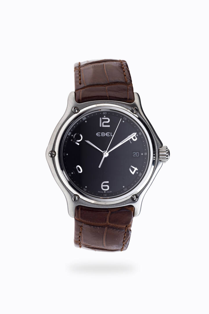 Diam. 38 mm Cassa in acciaio con fondello avvitato. Quadrante nero con numeri arabi applicati datario al 3 ed indicazione centrale dei secondi continui. Bracciale in pelle con chiusura clasp. Movimento al quarzo Corredato di scatola