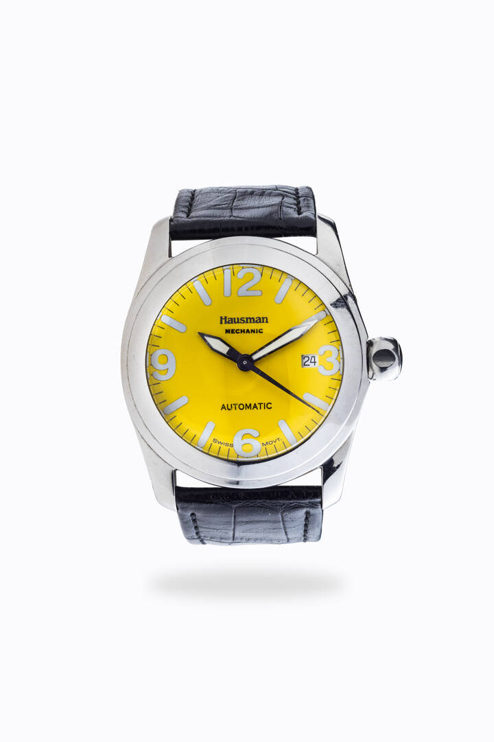 Diam. 45 mm Cassa in acciaio di forma con fondello a vite e vetro bombato. Quadrante giallo con indici luminescenti numeri arabi ai quarti e datario al 3 Movimento a carica automatica Il cinturino dell'orologio qui fotografato poiché eseguito con pellame di specie protetta non è in vendita ma presentato a solo scopo dimostrativo/ espositivo. Al momento della vendita dell'orologio tale cinturino non verrà fornito al nuovo acquirente