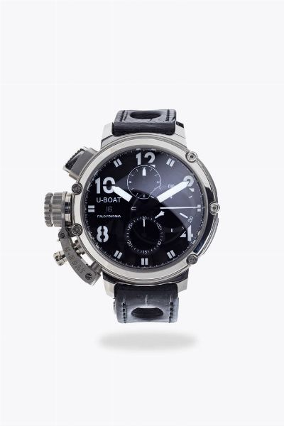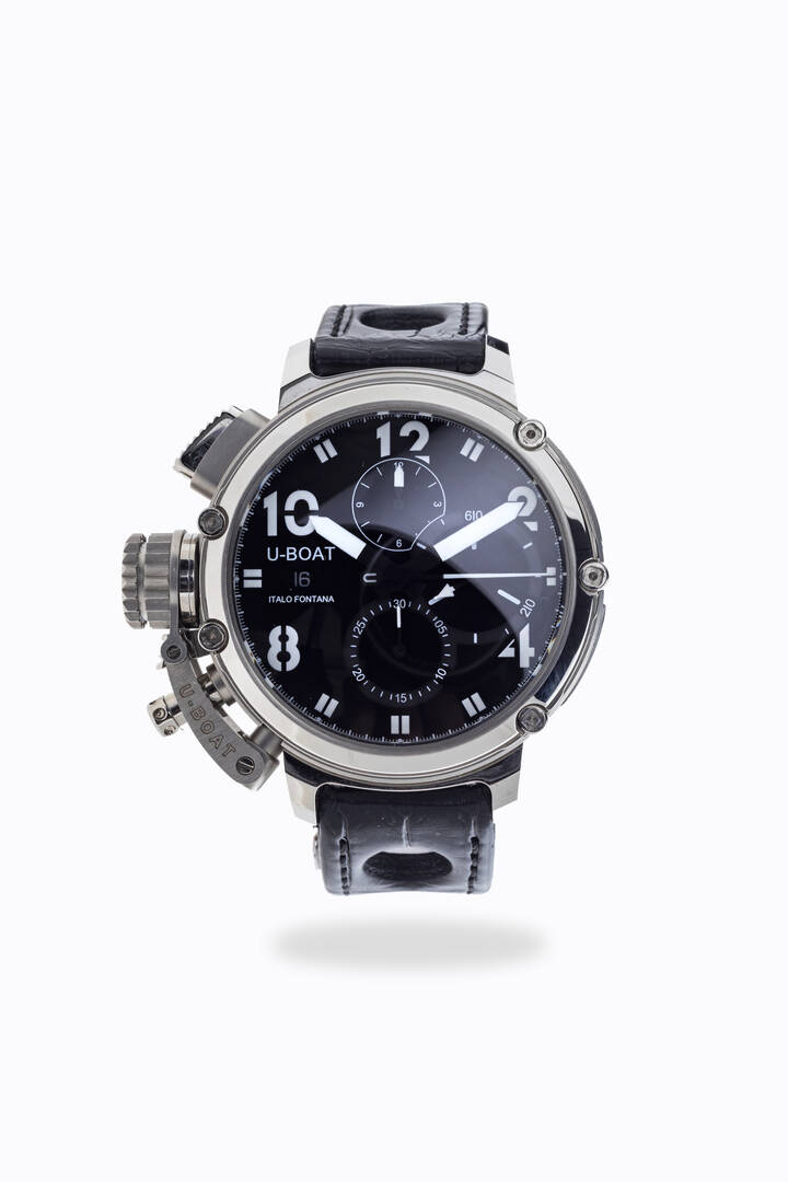Diam. 46 mm Cassa in acciaio con pulsanti e corona disposti a sinistra della cassa adatto ai mancini. Fondello in vetro che lascia intravedere il movimento. Quadrante nero con numeri arabi intervallati ad indici serigrafati. Datario ad ore 9 indicazione delle 12 ore al 12 dei secondi continui al 3 e dei 30 minuti al 6 Movimento a carica automatica Corredato di scatola e garanzia