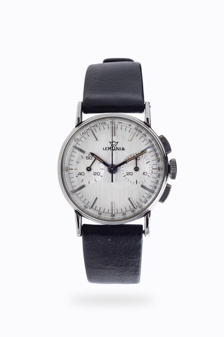 Diam. 30 mm Cassa in acciaio con fondello a scatto. Quadrante argento con indici geometrici applicati sub contatore dei secondi continui ad ore 9 e dei 30 minuti cronografici al 3. Movimento a carica manuale cal.8