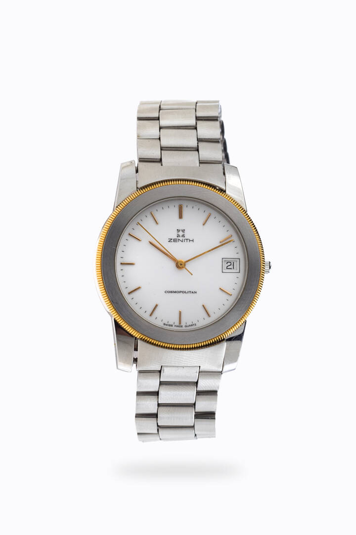Diam. 34 mm Cassa in acciaio con lunetta dorata. Quadrante bianco con indici applicati e datario al 3. Movimento al quarzo.