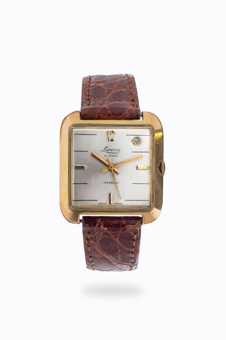 Diam. 32 mm Cassa placcata con fondello a scatto. Quadrante argento con datario al 2 Movimento a carica manuale