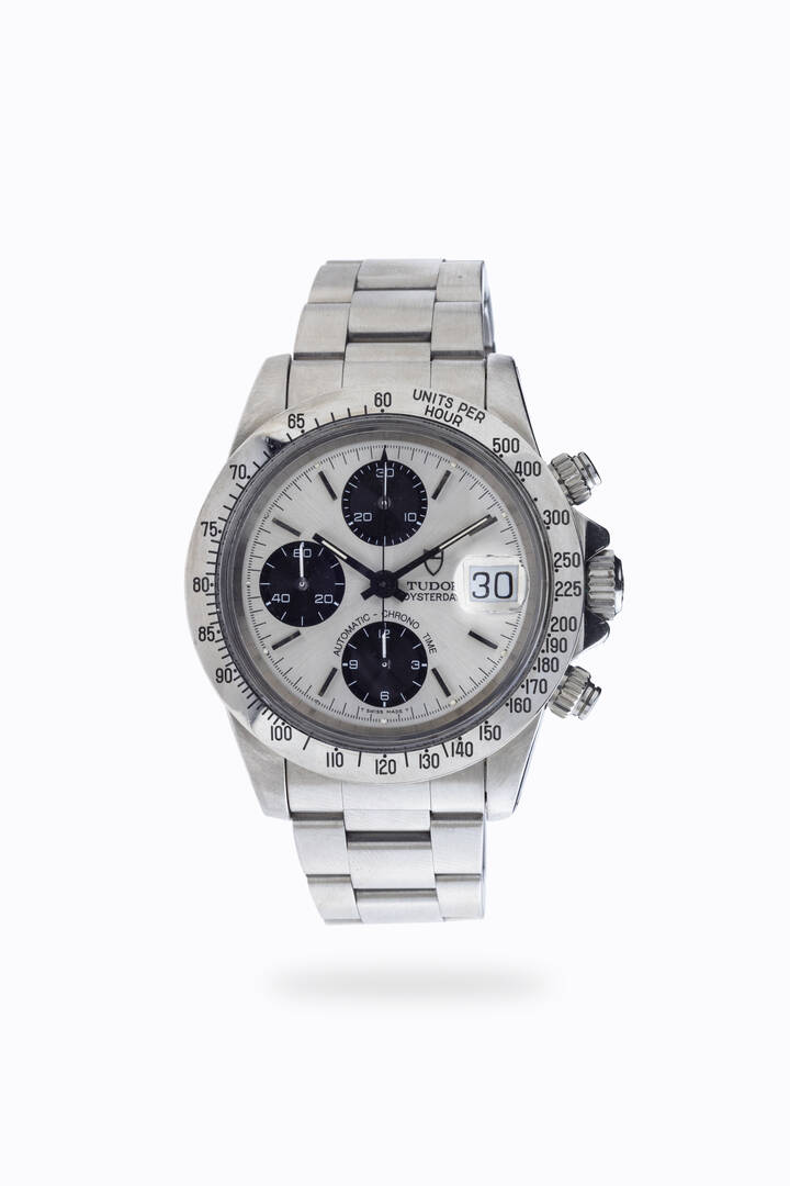 Diam. 40 mm Cassa in acciaio con fondello corona e tasti della cronografia a vite e marchiati Rolex. Lunetta tachimetrica in acciaio. Quadrante argento di grande qualità con indici geometrici applicati e contatori a contrasto neri che indicano rispettivamente ad ore 9 i secondi continui al 12 i 30 minuti ed al 6 le 12 ore. Presente datario al 3. Bracciale in acciaio “Oyster” integrato con chiusura clasp. Movimento a carica automatica cal.7750