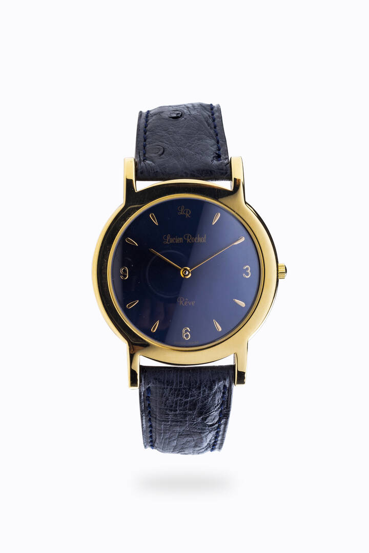 Diam. 35 mm Cassa dorata con fondello a scatto. Quadrante blu con indici applicati Movimento a carica automatica