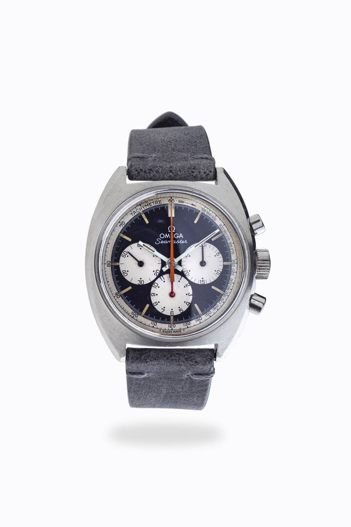 Diam. 38 mm Cassa in acciaio con tasti della cronografia a pompa e vetro plastica. Quadrante nero con indici luminescenti patinati; contatori dei secondi al 9 ore al 6 30 minuti al 3. Fondello a vite con ippocampo. Movimento carica manuale calibro 321 Il cinturino dell'orologio qui fotografato poiché eseguito con pellame di specie protetta non è in vendita ma presentato a solo scopo dimostrativo/ espositivo. Al momento della vendita dell'orologio tale cinturino non verrà fornito al nuovo acquirente