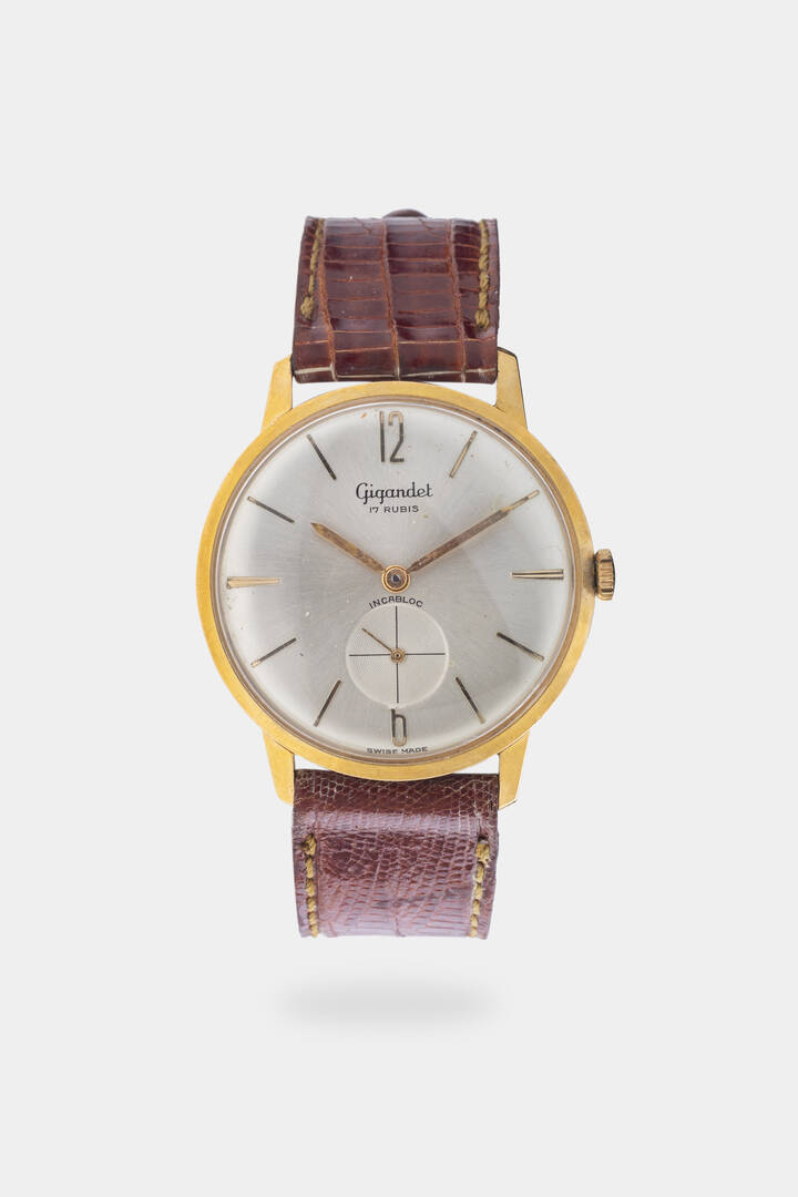 Diam. 34 mm Cassa in oro con fondello a pressione. Quadrante argento soleil con indici geometrici applicati. Contatore dei secondi continui al 6. Movimento a carica manuale Da revisionare bloccato. Il cinturino dell'orologio qui fotografato poiché eseguito con pellame di specie protetta non è in vendita ma presentato a solo scopo dimostrativo/ espositivo. Al momento della vendita dell'orologio tale cinturino non verrà fornito al nuovo acquirente