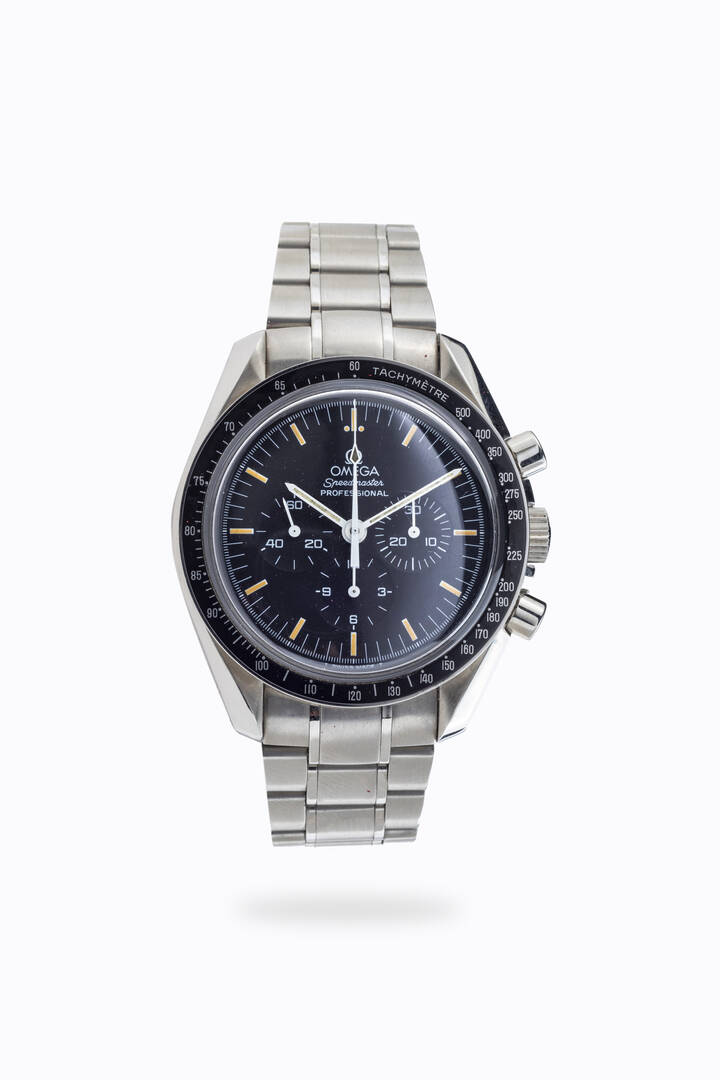 Diam. 42 mm Cassa in acciaio con tasti della cronografia a pompa vetro plastica e fondello trasparente. Quadrante nero con indici luminescenti patinati; contatori dei secondi al 9 ore al 6 30 minuti al 3. Bracciale in acciaio con chiusura clasp ref.1499/842 Movimento carica manuale calibro 1863 Completo estratto degli archivi e box