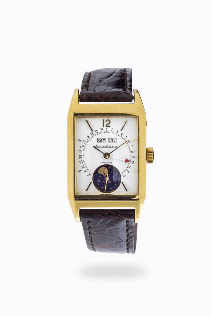 23x40 mm Cassa in oro con fondello avvitato. Quadrante bianco con indici geometrici applicati fasi lunari al 6 datario al 12 data serigrafata sul quadrante ed indicata da un' apposita lancetta rossa. Movimento a carica manuale cal.K1014. Il cinturino dell'orologio qui fotografato poiché eseguito con pellame di specie protetta non è in vendita ma presentato a solo scopo dimostrativo/ espositivo. Al momento della vendita dell'orologio tale cinturino non verrà fornito al nuovo acquirente